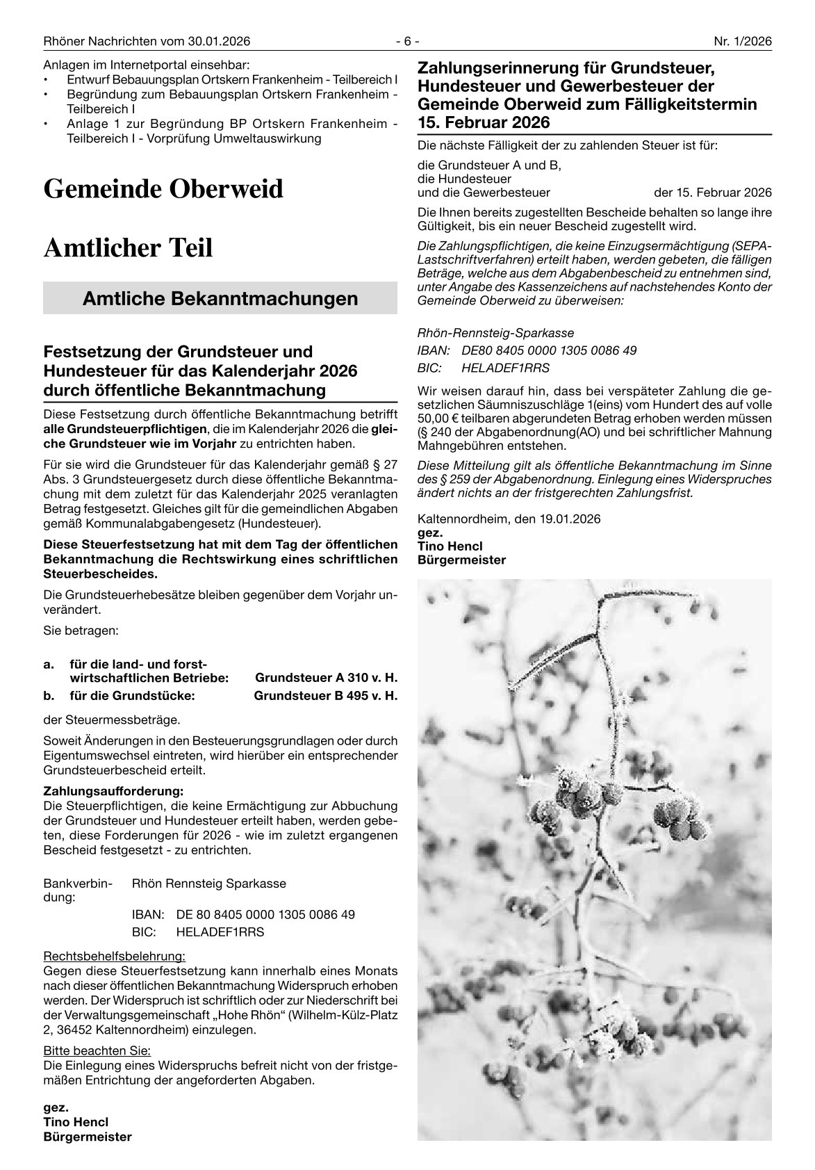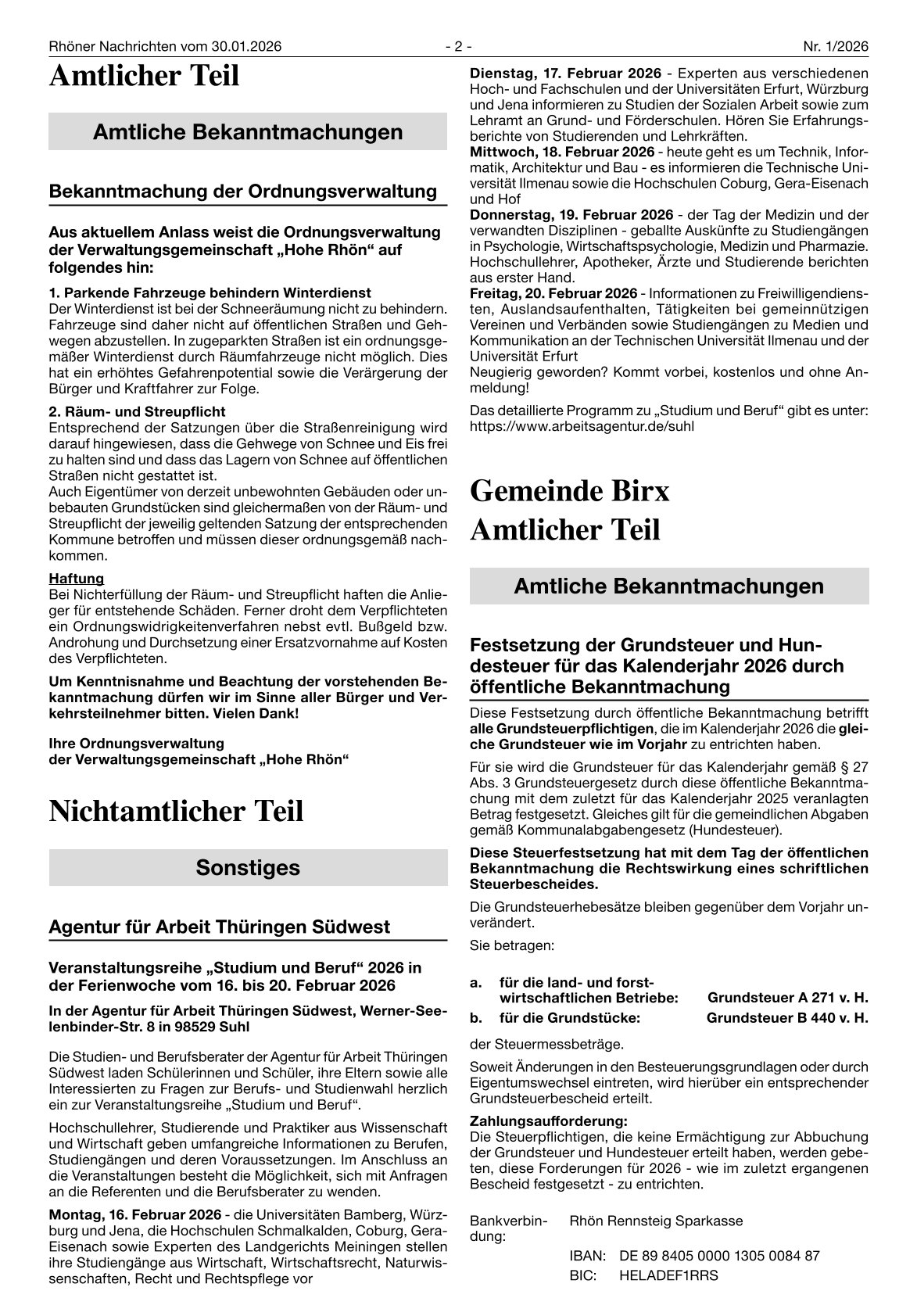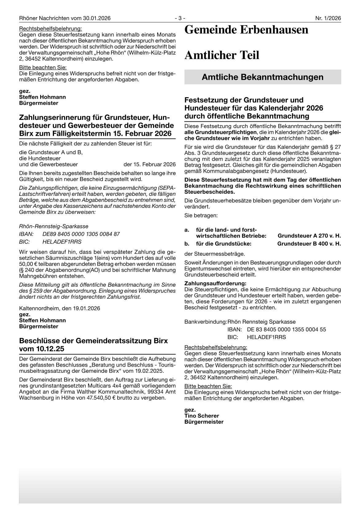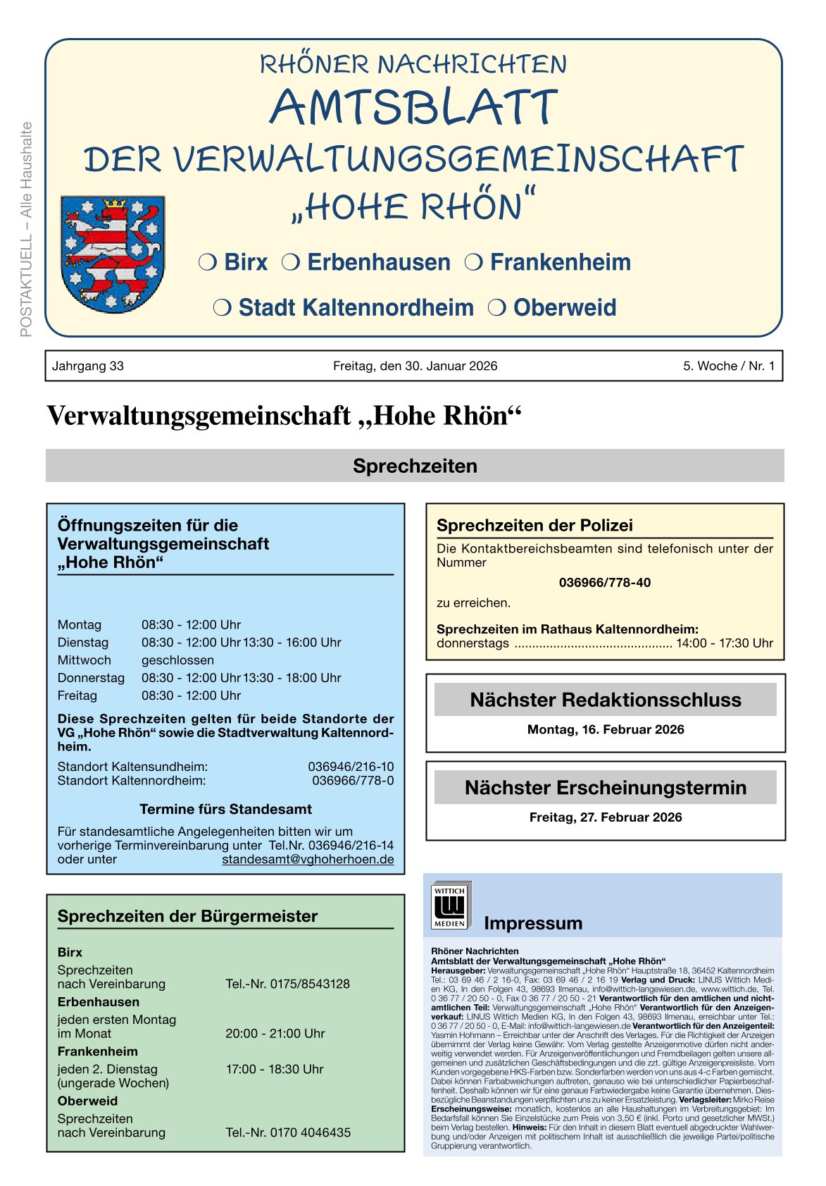 Amtsblatt der VG Hohe Rhön – Januar Ausgabe 2026 Posted by Redaktion31. Januar 2026 Das Amtsblatt der Verwaltungsgemeinschaft „Hohe Rhön“ mit den Gemeinden Birx, Erbenhausen, Frankenheim, Stadt Kaltennordheim und Oberweid.