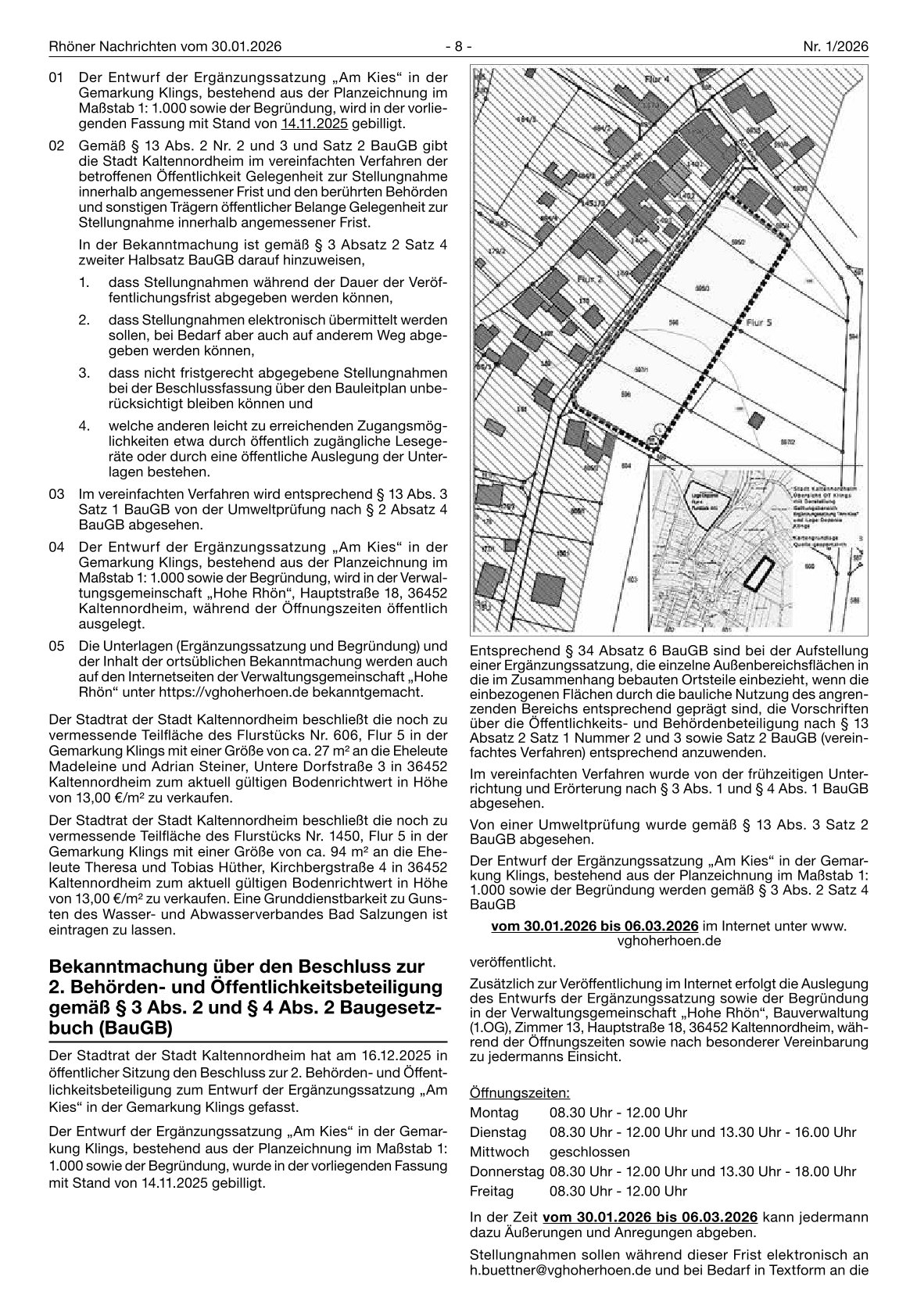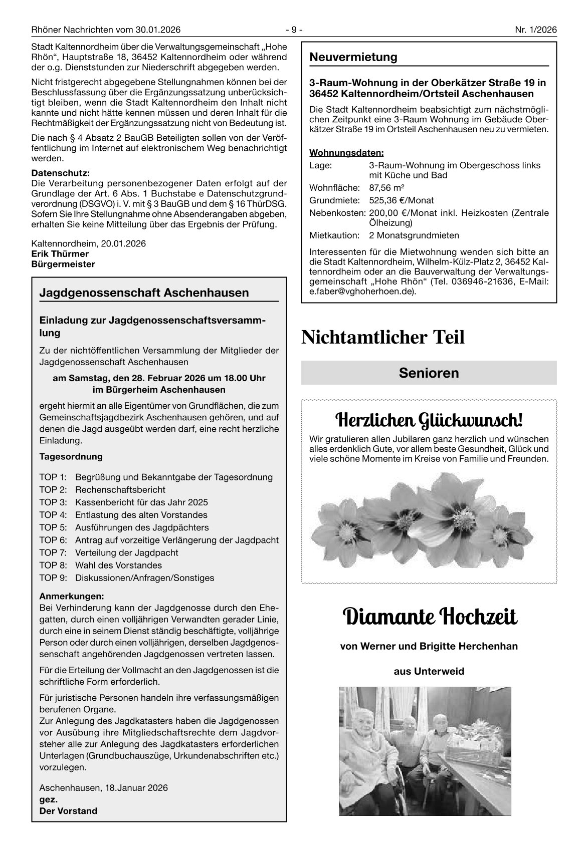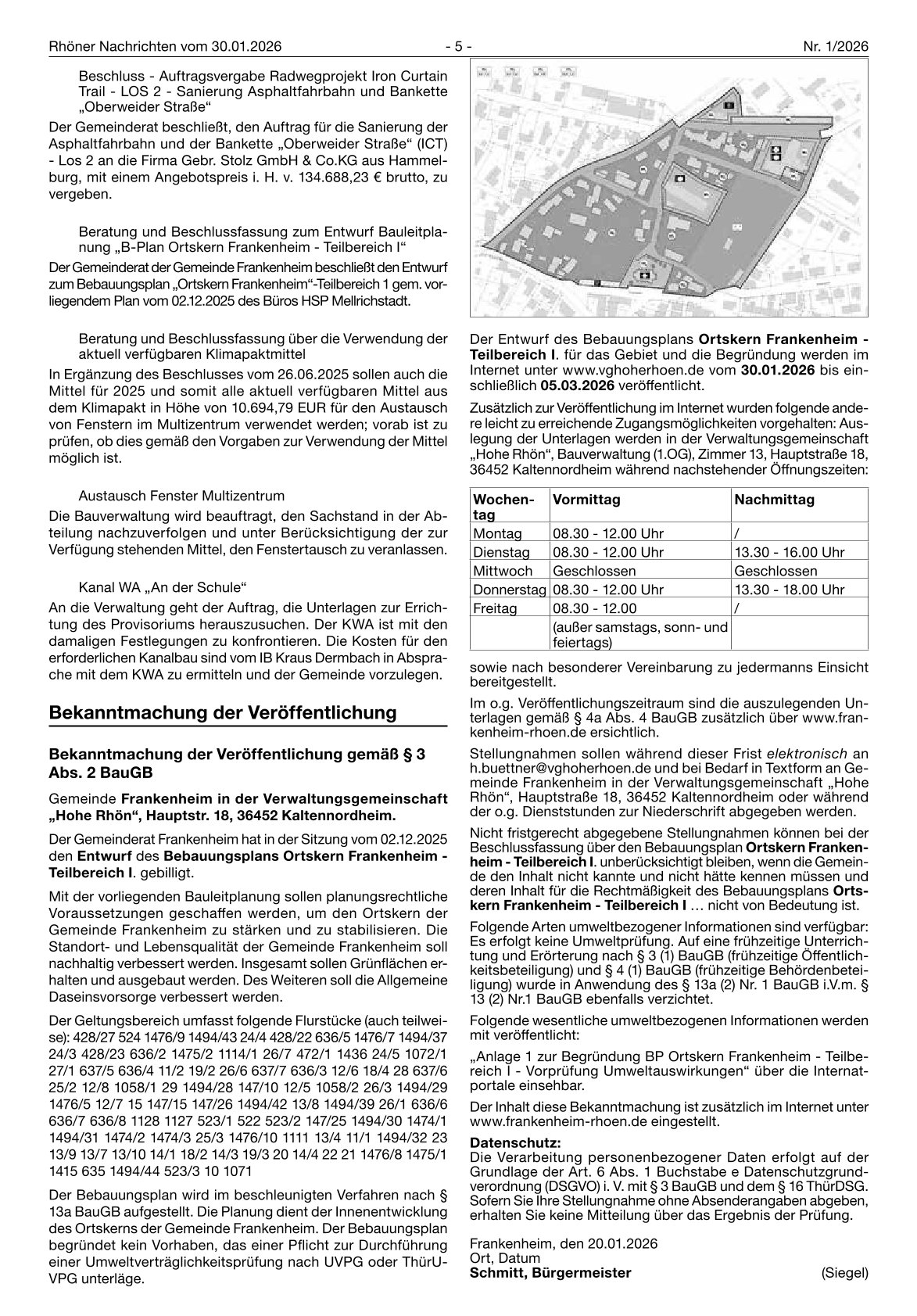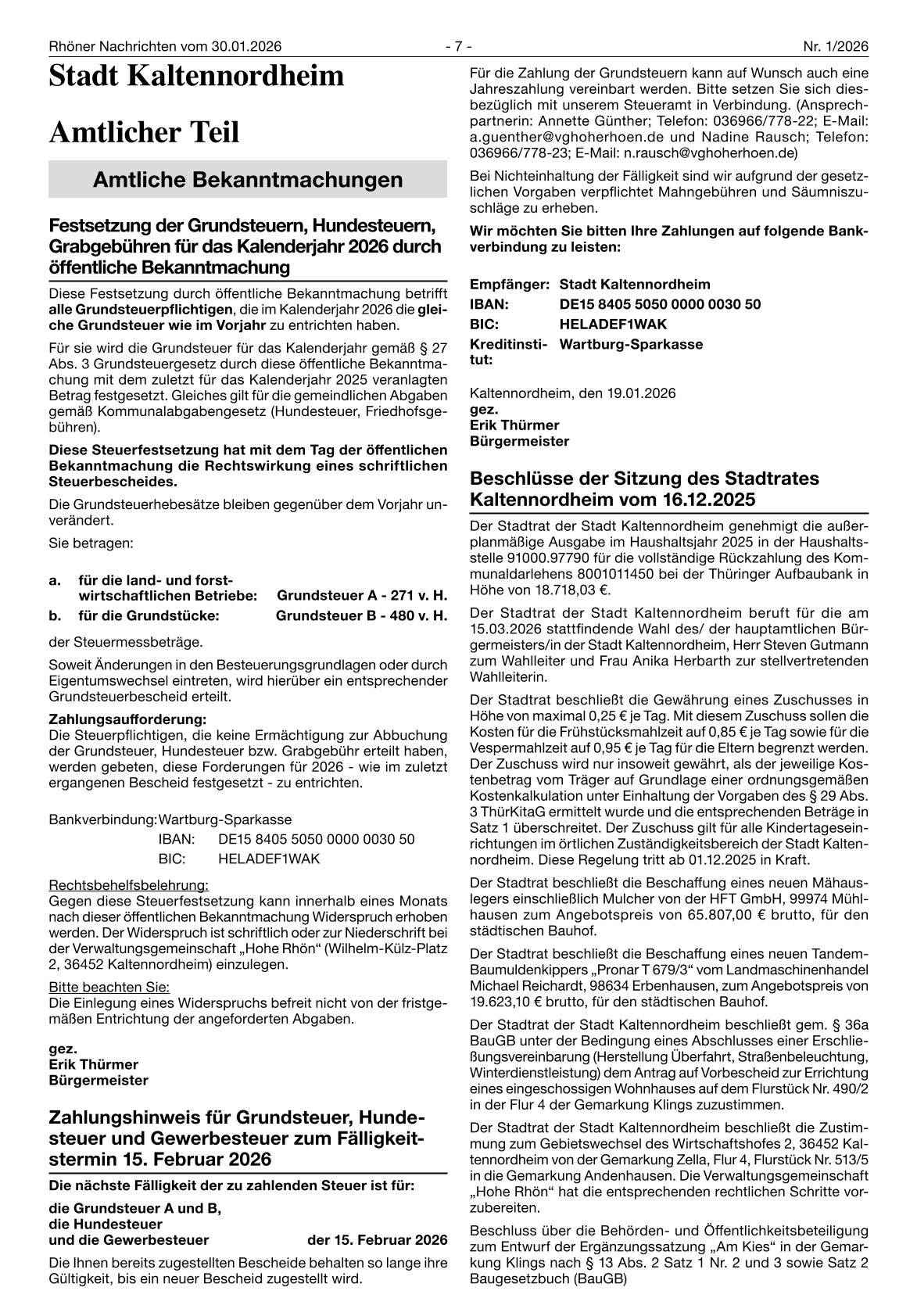 Amtsblatt der VG Hohe Rhön – Januar Ausgabe 2026 Posted by Redaktion31. Januar 2026 Das Amtsblatt der Verwaltungsgemeinschaft „Hohe Rhön“ mit den Gemeinden Birx, Erbenhausen, Frankenheim, Stadt Kaltennordheim und Oberweid.