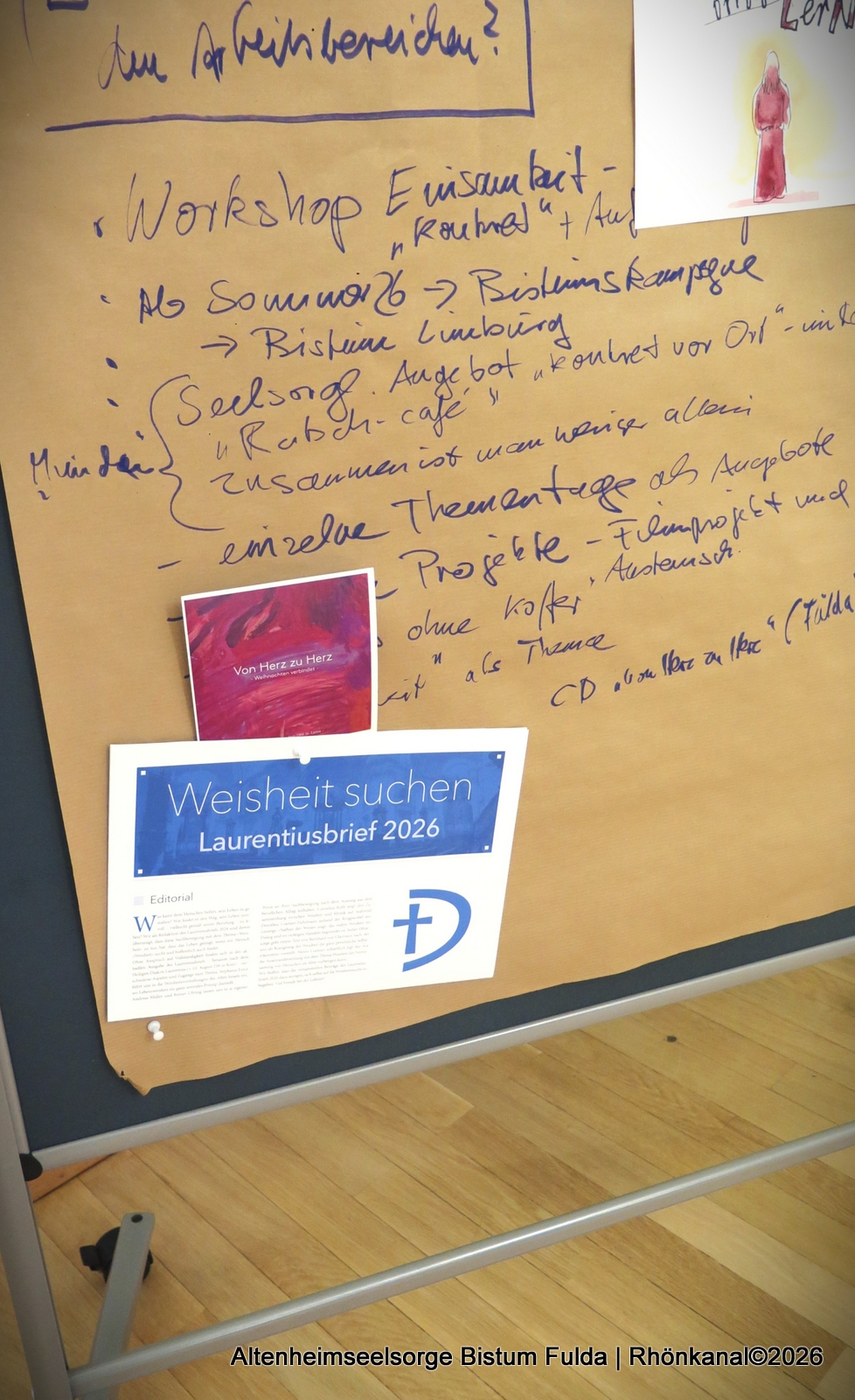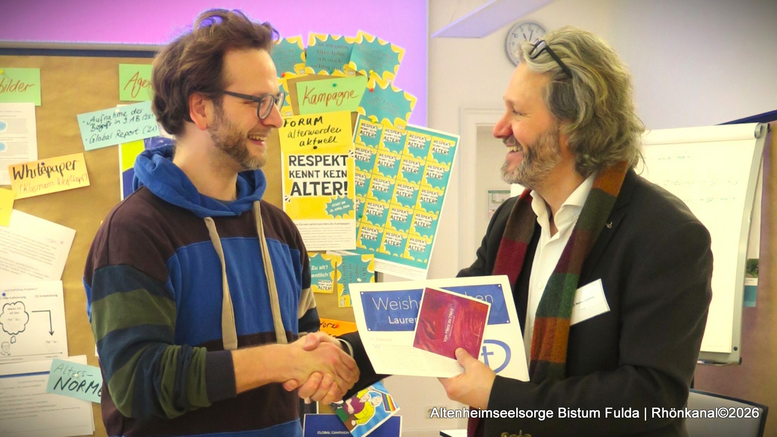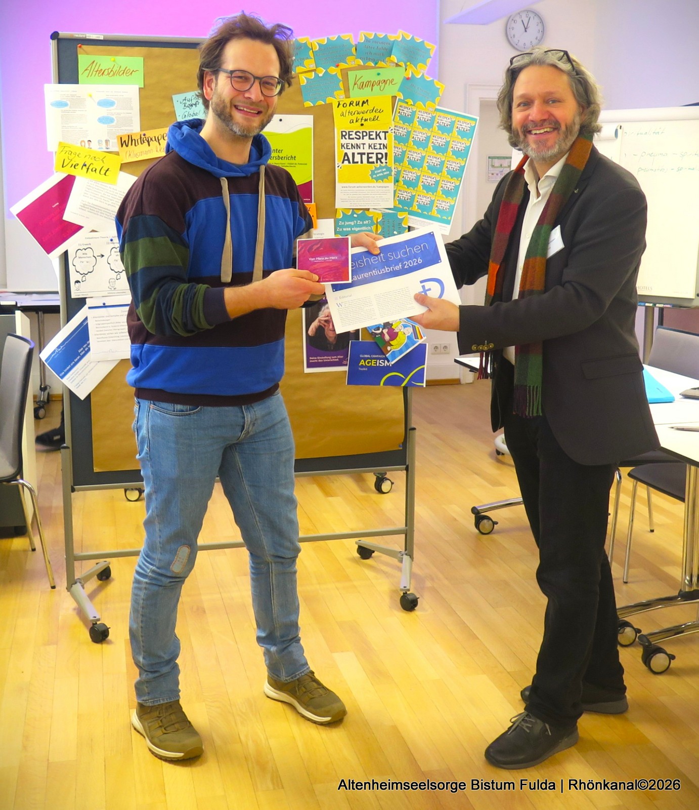 Diakon Dr. mult. Meins G.S. Coetsier, Delegierter des Bistums im Bundesforum Katholische Seniorenarbeit und Koordinator der Altenheimseelsorge im Dekanat Fulda, überreichte als Zeichen der Verbundenheit die im Bistum produzierte CD von und für ältere Menschen mit dem Titel „Von Herz zu Herz“ sowie den Laurentiusbrief 2026 „Weisheit Suchen“ an Diözesanbüroleiter Braun der Erzdiözese.