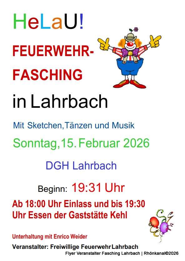 Am Sonntag, 15. Februar 2026, lädt die Freiwillige Feuerwehr Lahrbach zum traditionellen und legendären Fastnachtsabend ein. Beginn ist um 19.31 Uhr im DGH Lahrbach, der Einlass startet bereits ab 18.00 Uhr. Bis 19.30 Uhr besteht die Möglichkeit, sich mit leckeren Spezialitäten aus dem Hause Kehl für einen langen närrischen Abend zu stärken.
