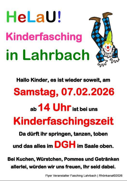 Den Auftakt macht am Samstag, 07. Februar 2026, der Kinderfasching im Dorfgemeinschaftshaus Lahrbach – Saal oben. Ab 14.00 Uhr gehört die Bühne ganz den kleinen Narren. Hier darf gesprungen, getanzt und ausgelassen getobt werden.