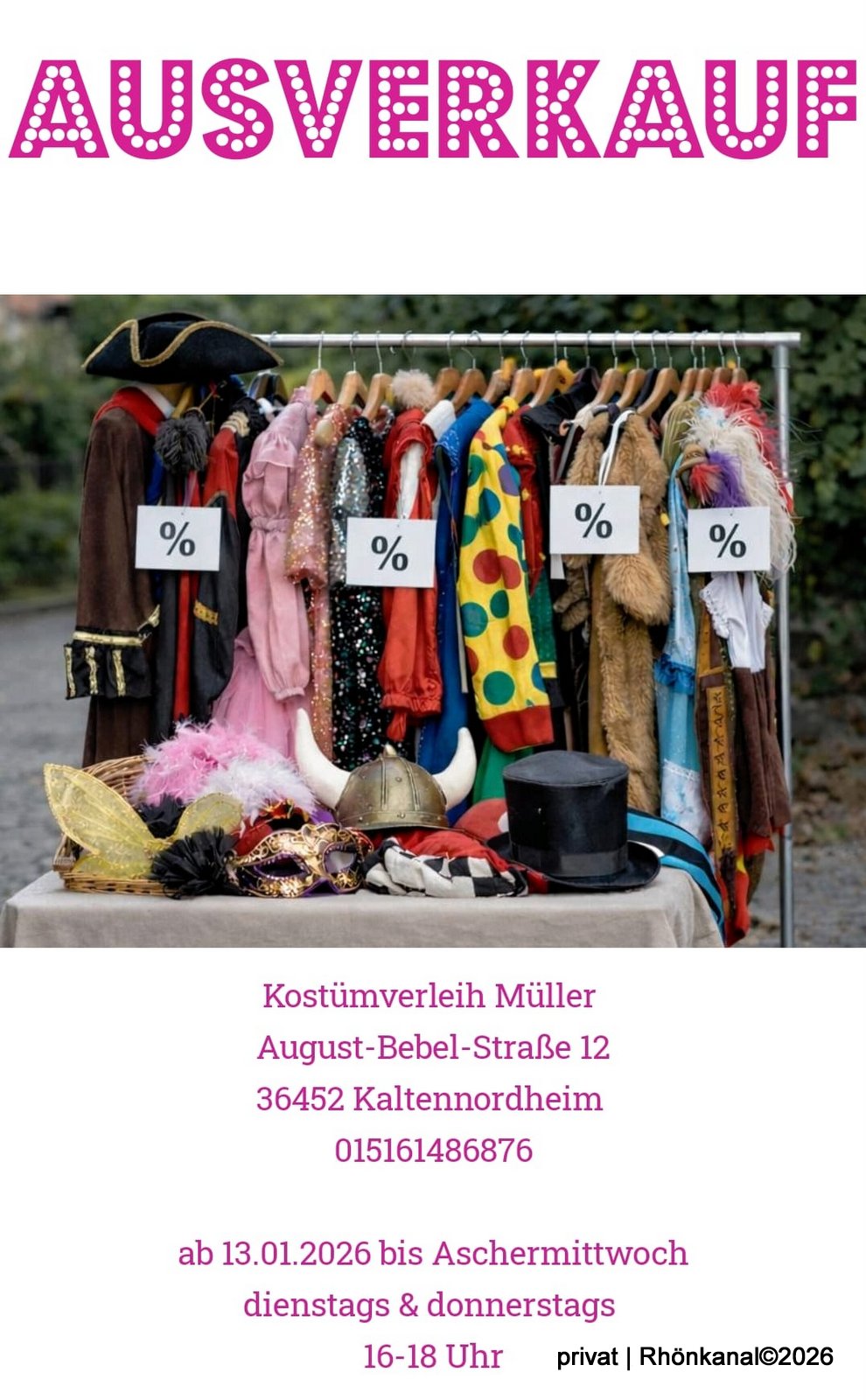 Der Karneval steht vor der Tür! Bist Du noch auf der Suche nach einem passenden Kostüm? Der ehemalige Kostümverleih von Dagmar Müller in Kaltennordheim macht AUSVERKAUF!