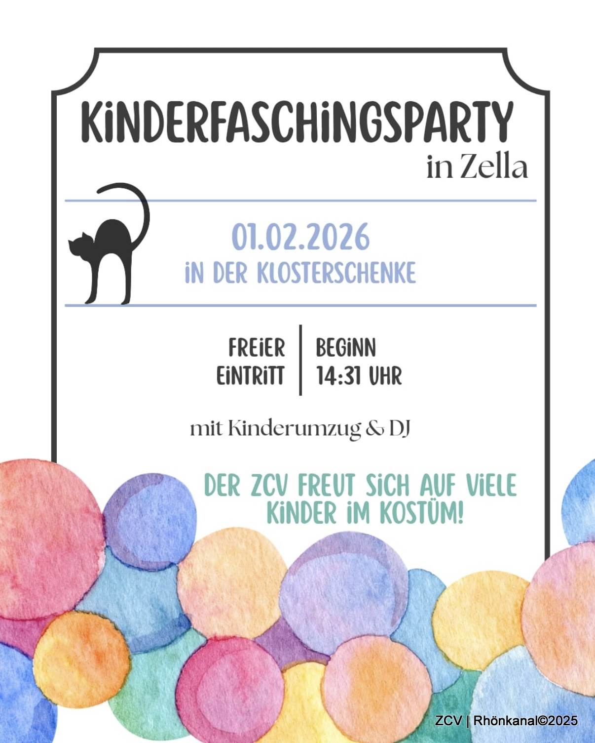 Am Sonntag, 1. Februar 2026, steigt um 14:31 Uhr in der Klosterschänke die große Kinderfaschingsparty mit Kinderumzug & DJ. Viele bunt verkleidete Kinder, Spiele und Musik sorgen für einen fröhlichen Nachmittag. Eintritt frei.