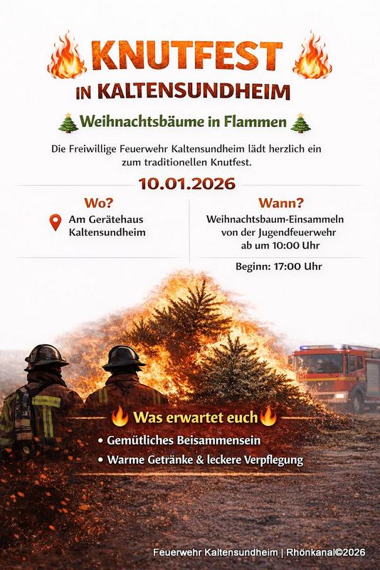 Weihnachten ist vorbei und die Bäume haben ausgedient. Am Samstag, den 10. Januar 2026 wird deshalb wieder zum Knutfest in Kaltensundheim eingeladen.