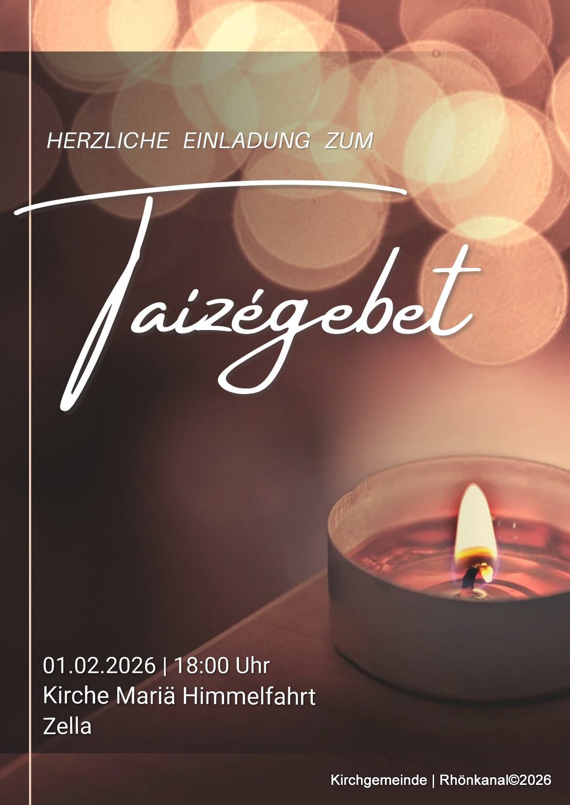 Herzliche Einladung zum Taizégebet in Zella! Getroffen wird sich am Sonntag, den 1. Februar 2026, um 18 Uhr in der kath. Kirche Mariä Himmelfahrt.