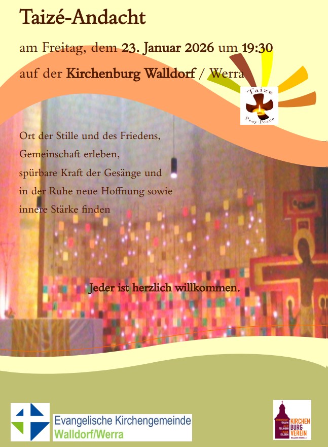 Die Evangelische Kirchgemeinde Walldorf lädt herzlich zur nächsten Taizé-Andacht ein. Diese findet am Freitag, den 23. Januar 2026, um 19.30 Uhr auf der Kirchenburg in Walldorf statt.