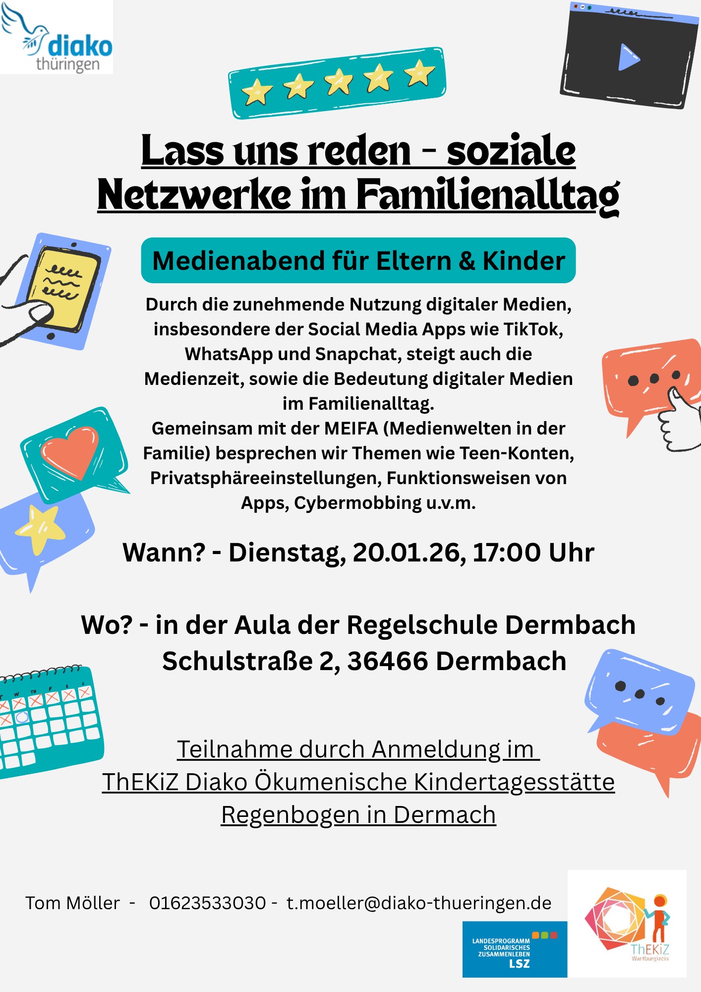 Das Angebot findet ab 17:00 Uhr in der Aula der Regelschule Dermbach in der Schulstraße 2 statt. Ziel des Abends ist es, Eltern und Kinder gemeinsam zu stärken, Unsicherheiten abzubauen und einen bewussten, sicheren Umgang mit digitalen Medien zu fördern.