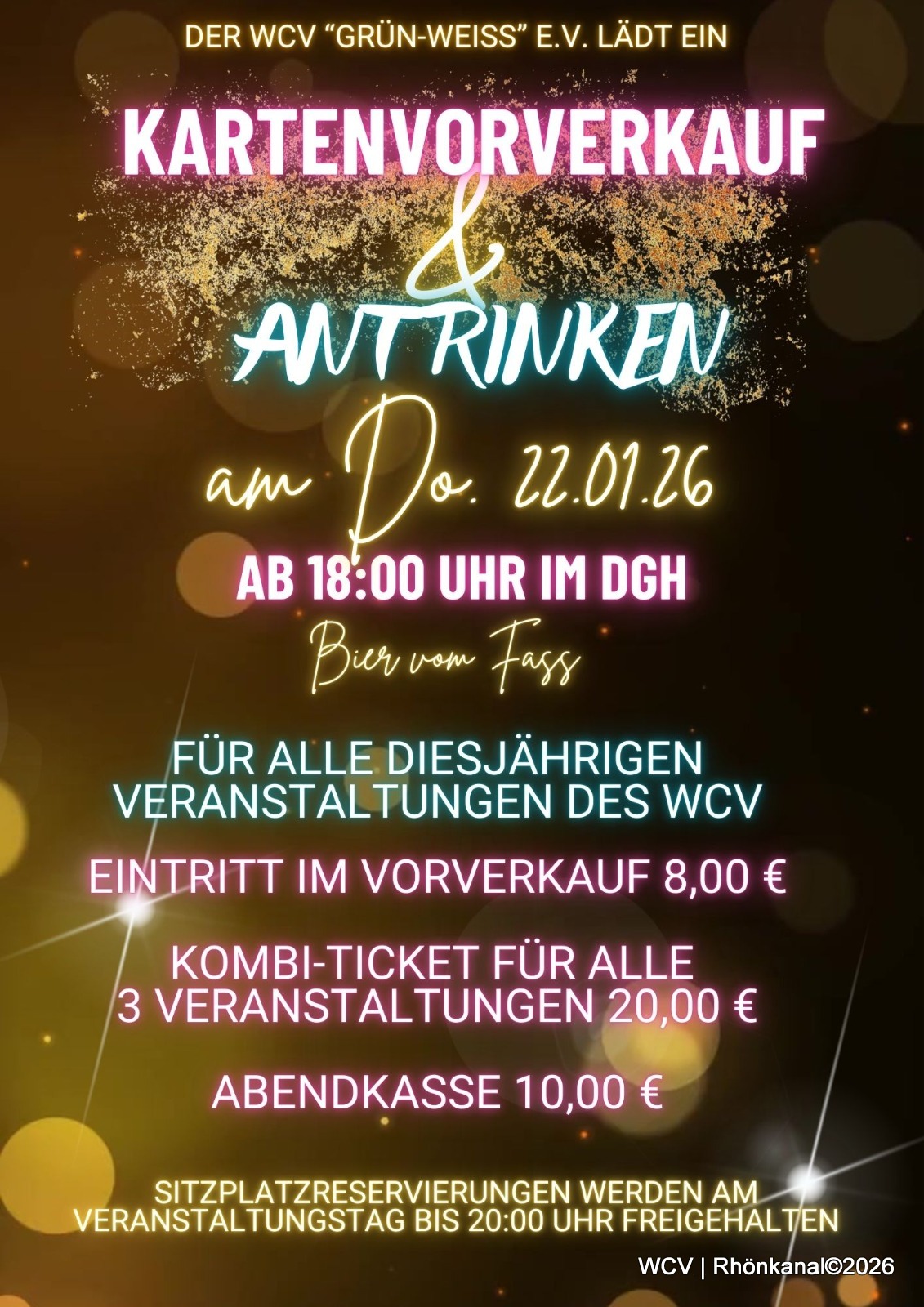 Der Vorverkauf am Donnerstag gilt für alle diesjährigen Veranstaltungen des WCV: Prinzenkürung, Freunde-Sitzung und Prunksitzung. Sitzplatzreservierungen werden am Veranstaltungstag bis 20 Uhr freigehalten.