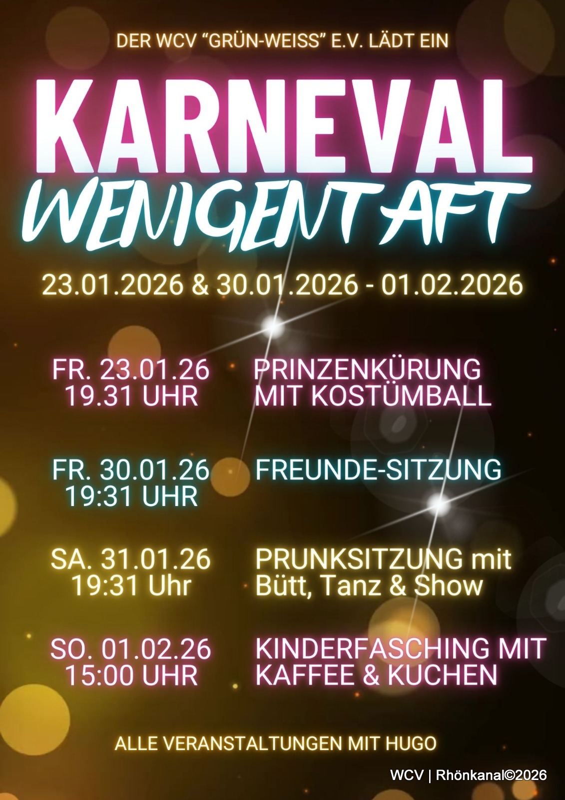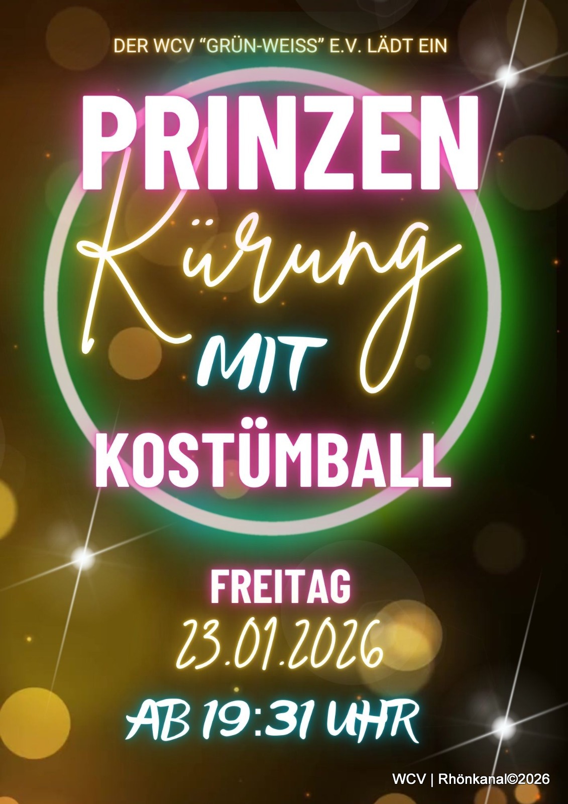 Der WCV „Grün-Weiss“ e.V. lädt am Freitag, den 23. Januar 2026, herzlich zur Prinzenkürung mit großem Kostümball ein.