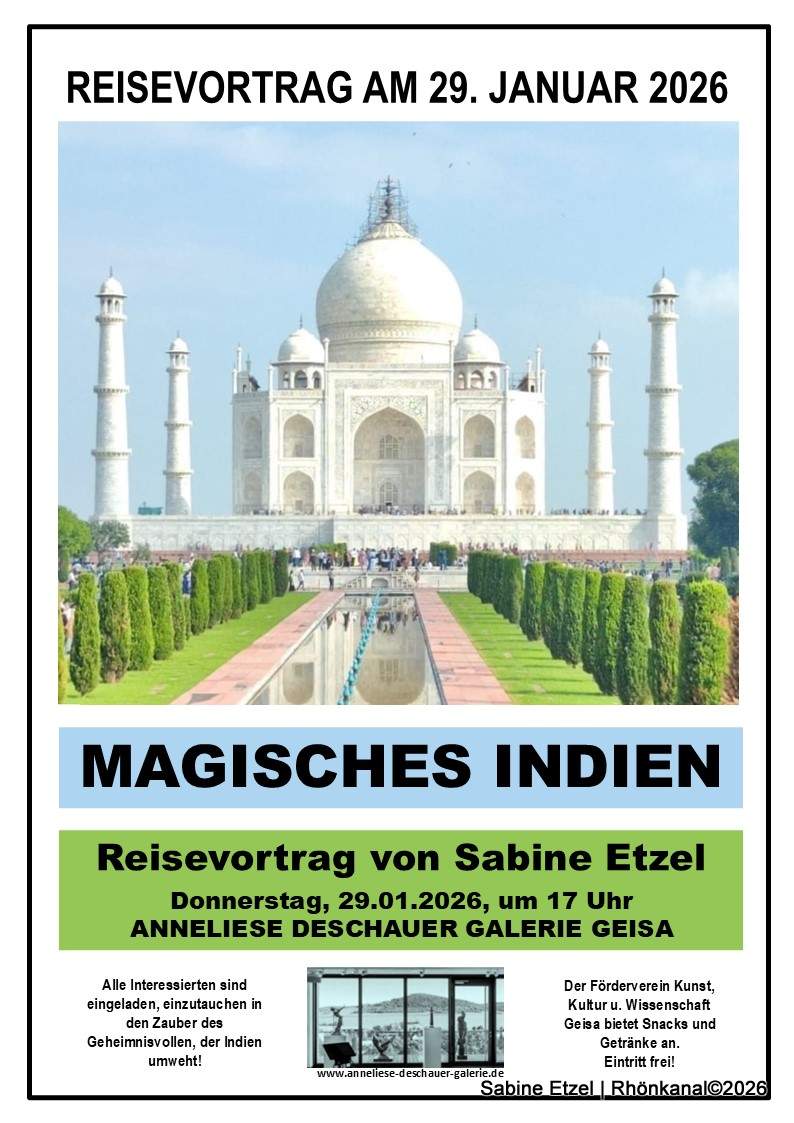 Alle, die sich gemeinsam mit Sabine Etzel auf diese gedankliche Reise in die Ferne begeben möchten, sind am Donnerstag, 29. Januar 2026, um 17:00 Uhr herzlich in die Anneliese-Deschauer-Galerie eingeladen. Der Eintritt ist frei. Für das leibliche Wohl sorgt der Förderverein mit Snacks und Getränken.