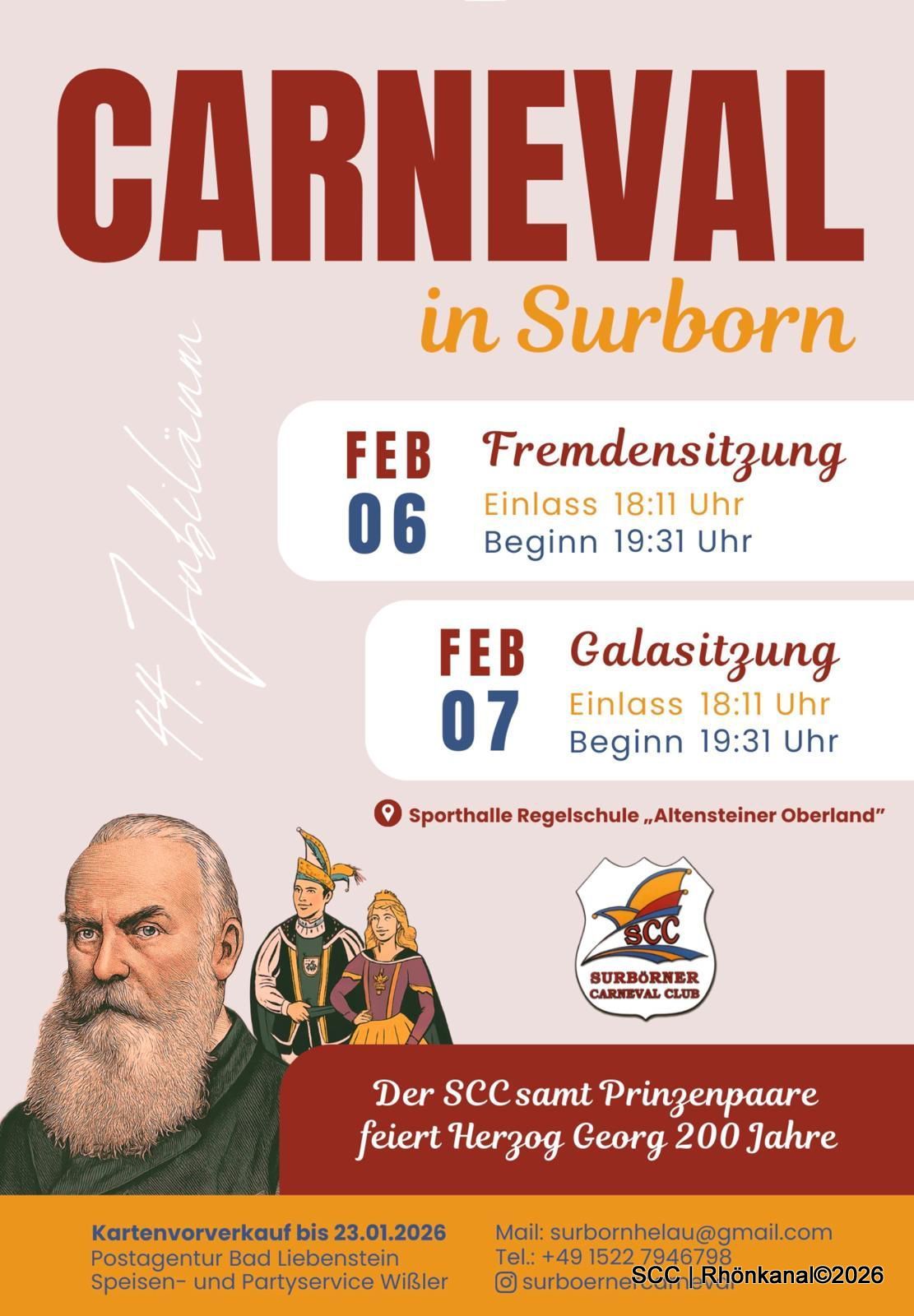 Unter dem Motto „Der SCC samt Prinzenpaare feiert Herzog Georg 200 Jahre“ lädt der Surbörner Carneval Club (SCC) am 6. und 7. Februar zum diesjährigen Carneval in Surborn ein.