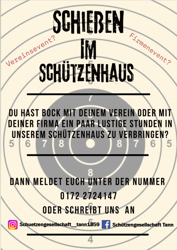 Wenn auch Sie Interesse an einem Schießnachmittag mit Ihrem Verein, Ihrer Firma oder Ihrer Familie haben, melden Sie sich gerne unter schuetzengesellschaft1859Tann@gmx.de oder besuchen Sie die Seite der Schützengesellschaft Tann Rhön auf Instagram oder Facebook.