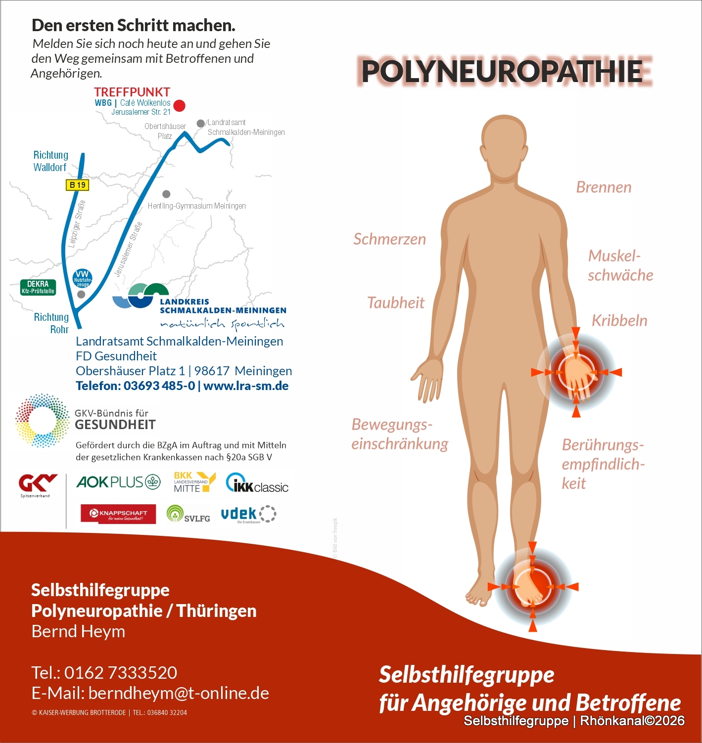 Am Mittwoch, den 21. Januar 2026 findet um 14 Uhr das nächste Treffen der Selbsthilfegruppe Polyneuropathie im WBG Meiningen statt.