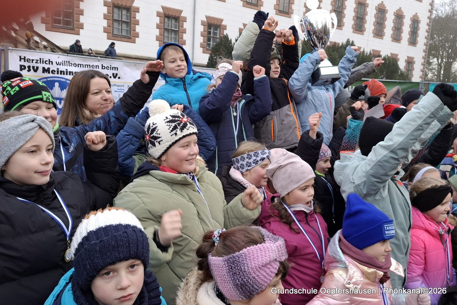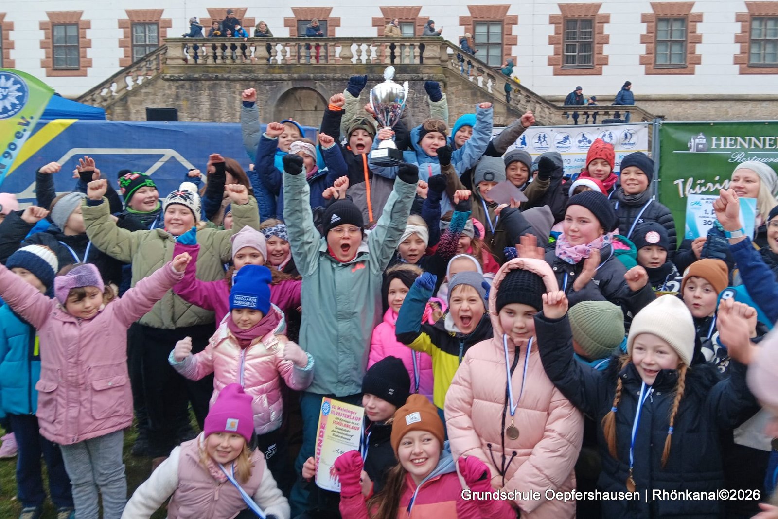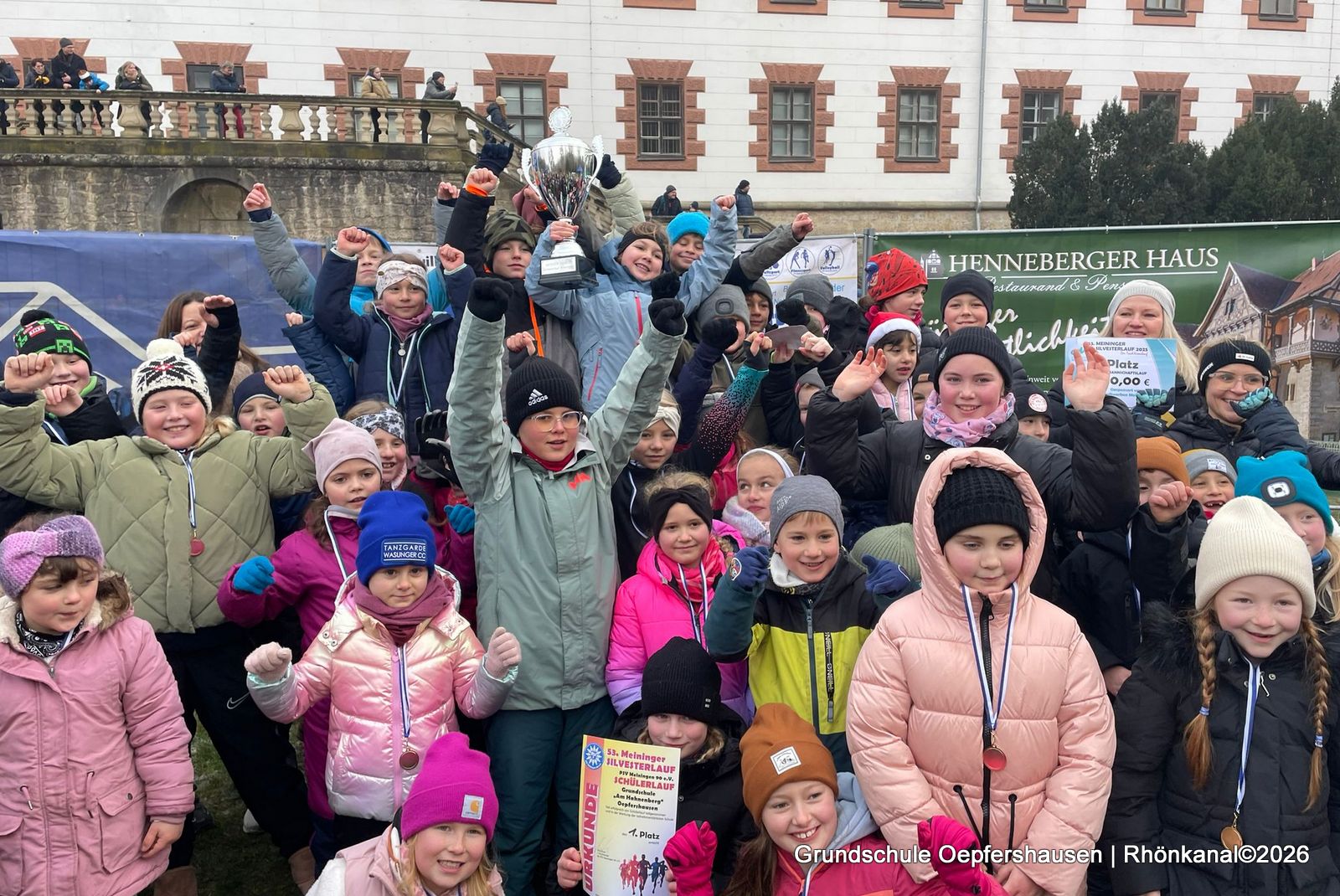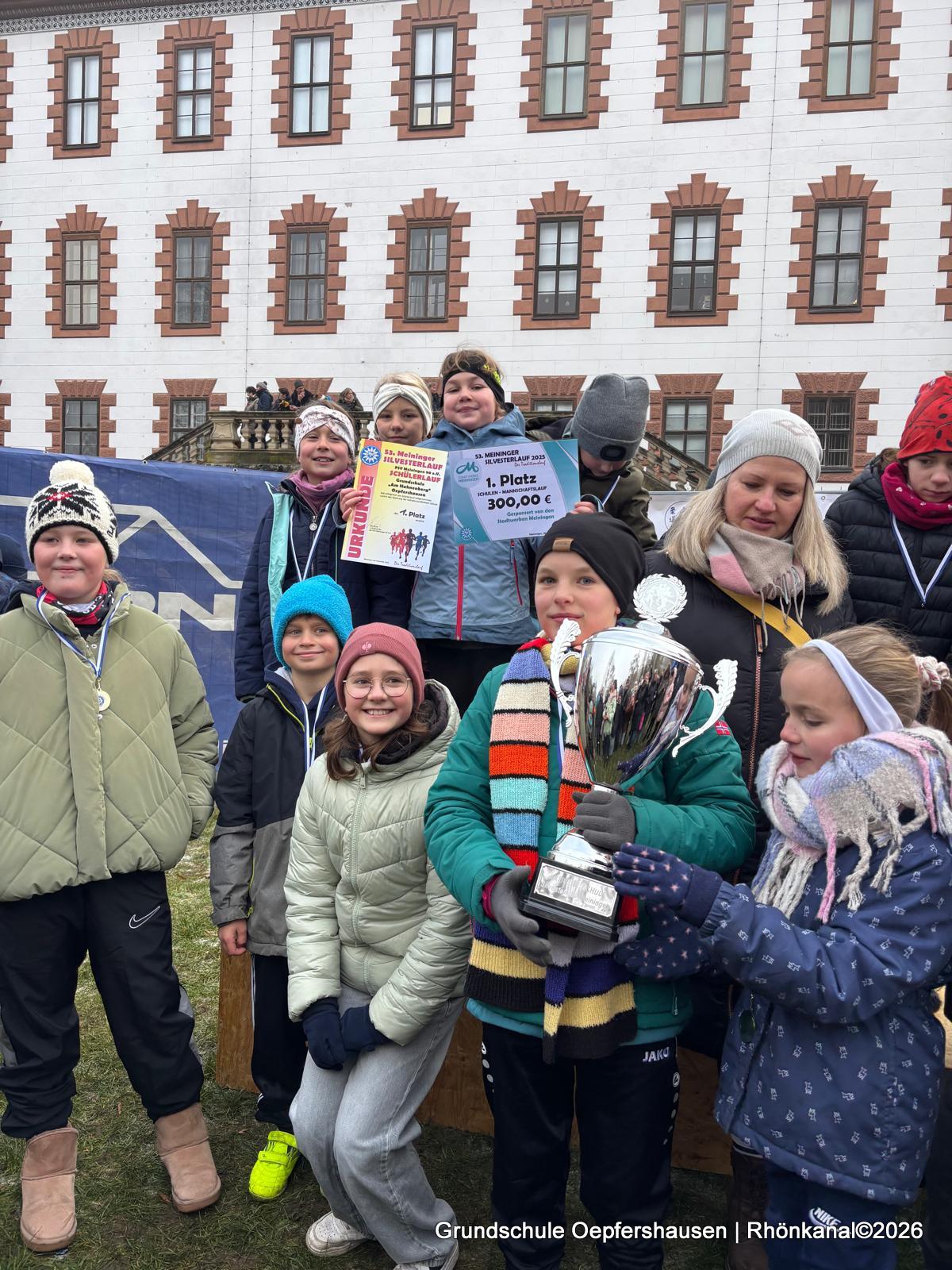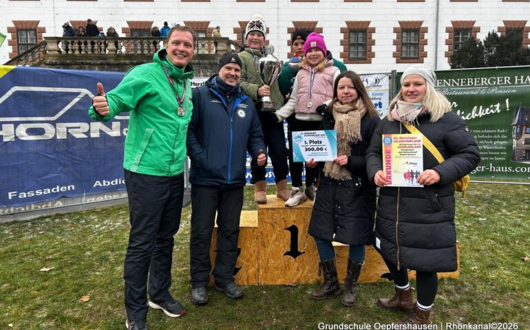 Der 1. Platz und 300 Euro für die aktivste Schule beim Silvesterlauf in Meiningen ging auch 2025 an die Grundschule „Am Hahnberg“! Damit gab es kein Halten mehr. Die Grundschüler stürmten das Podest und feierten ihren Sieg.