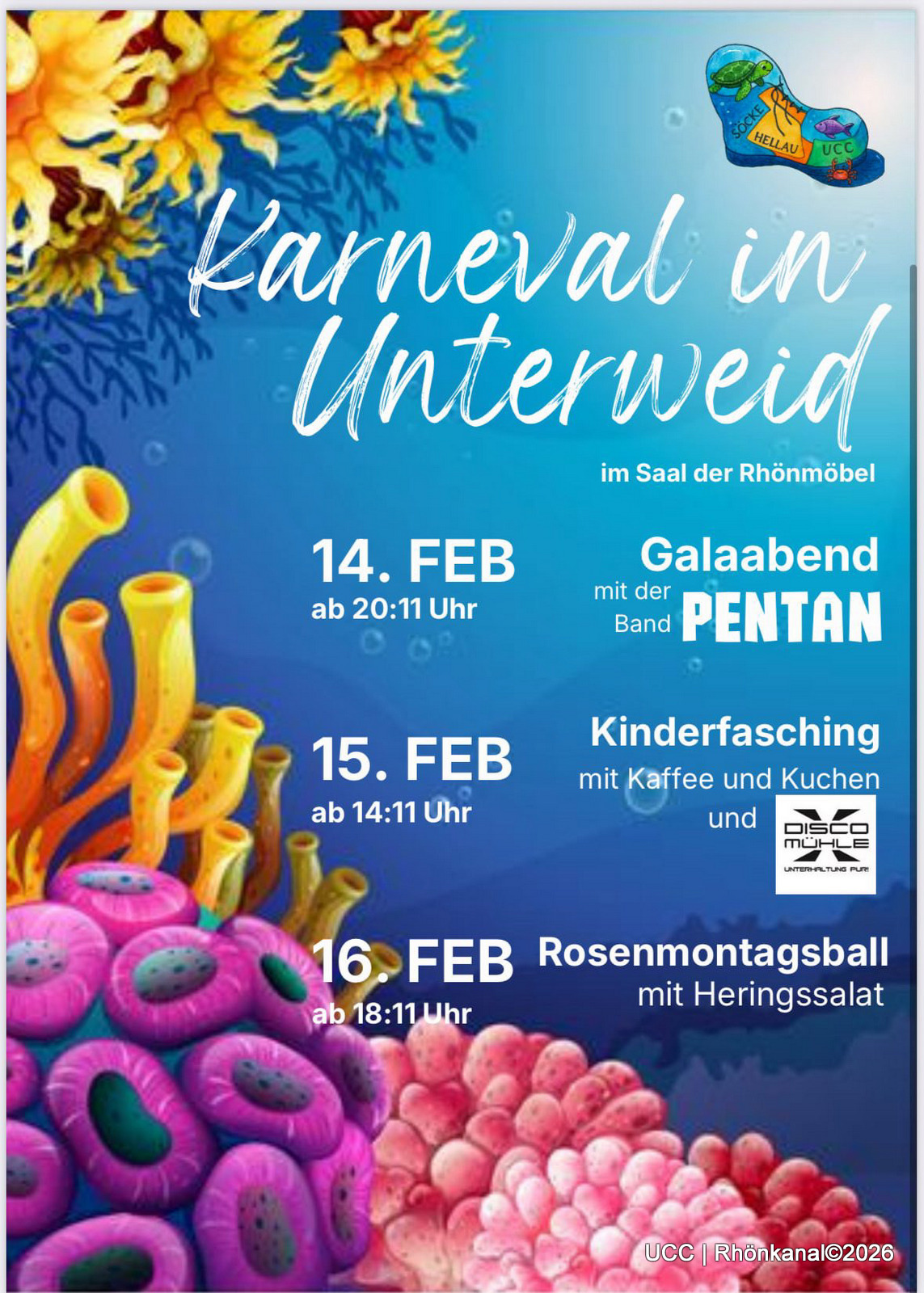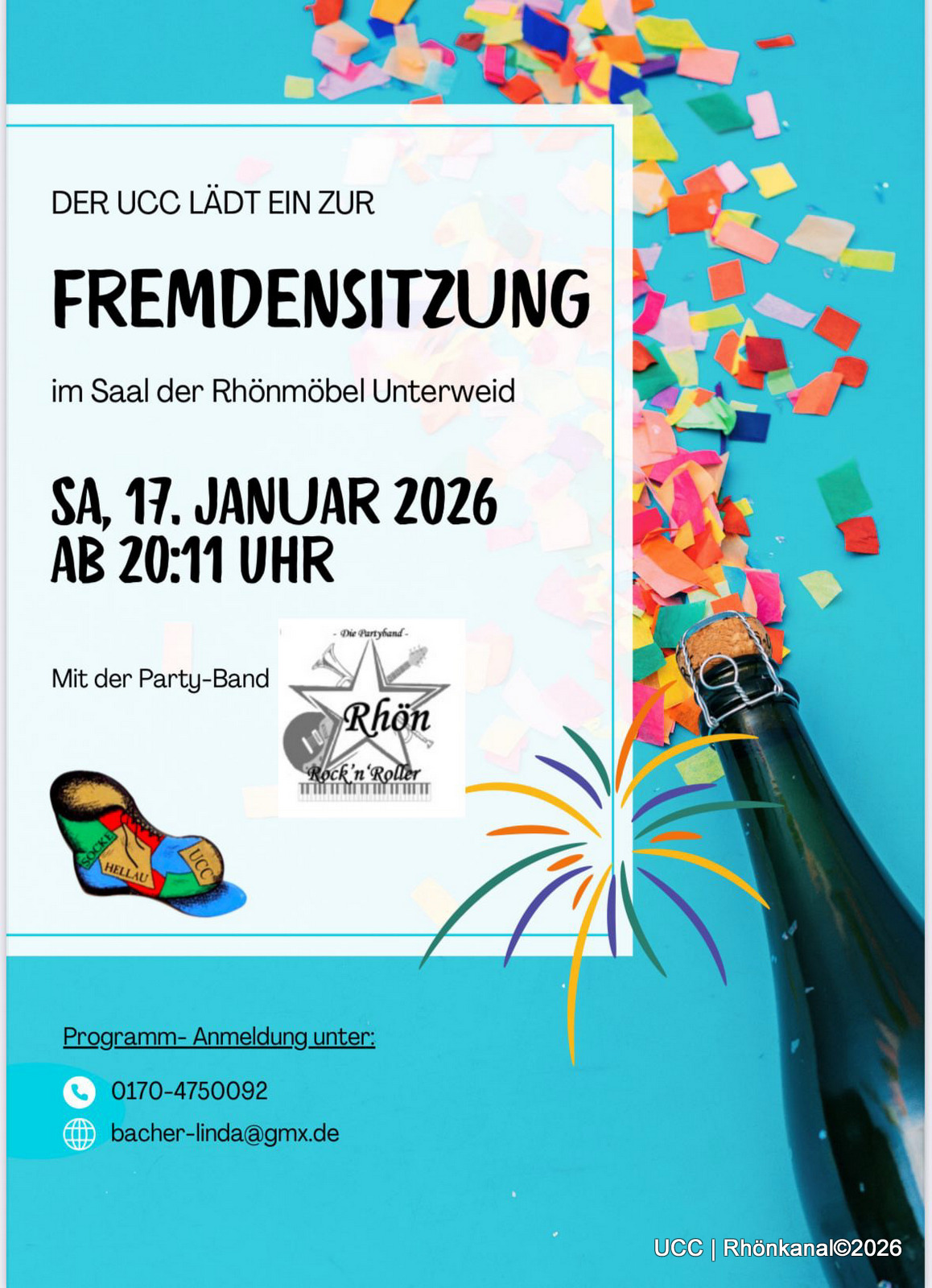 Der Unterweider Carneval Club (UCC) lädt auch in diesem Jahr wieder herzlich zum Mitfeiern ein. Mit einem kräftigen „Söcke Hellau“ startet die Saison am Samstag, den 17. Januar 2026.