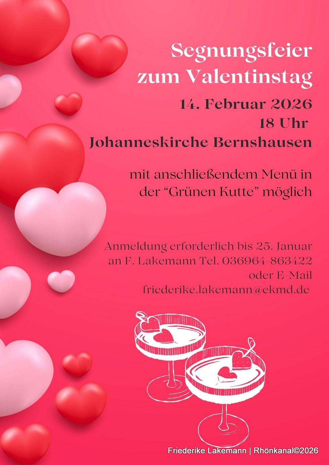 Am Samstag, den 14. Februar 2026 wird herzlich zum Valentinsabend nach Bernshausen eingeladen. Um 18 Uhr findet eine einzigartige Segnungsfeier in der Johanneskirche statt, die von von Susann und Ralf Irrgang aus Weilar musikalisch umrahmt wird.