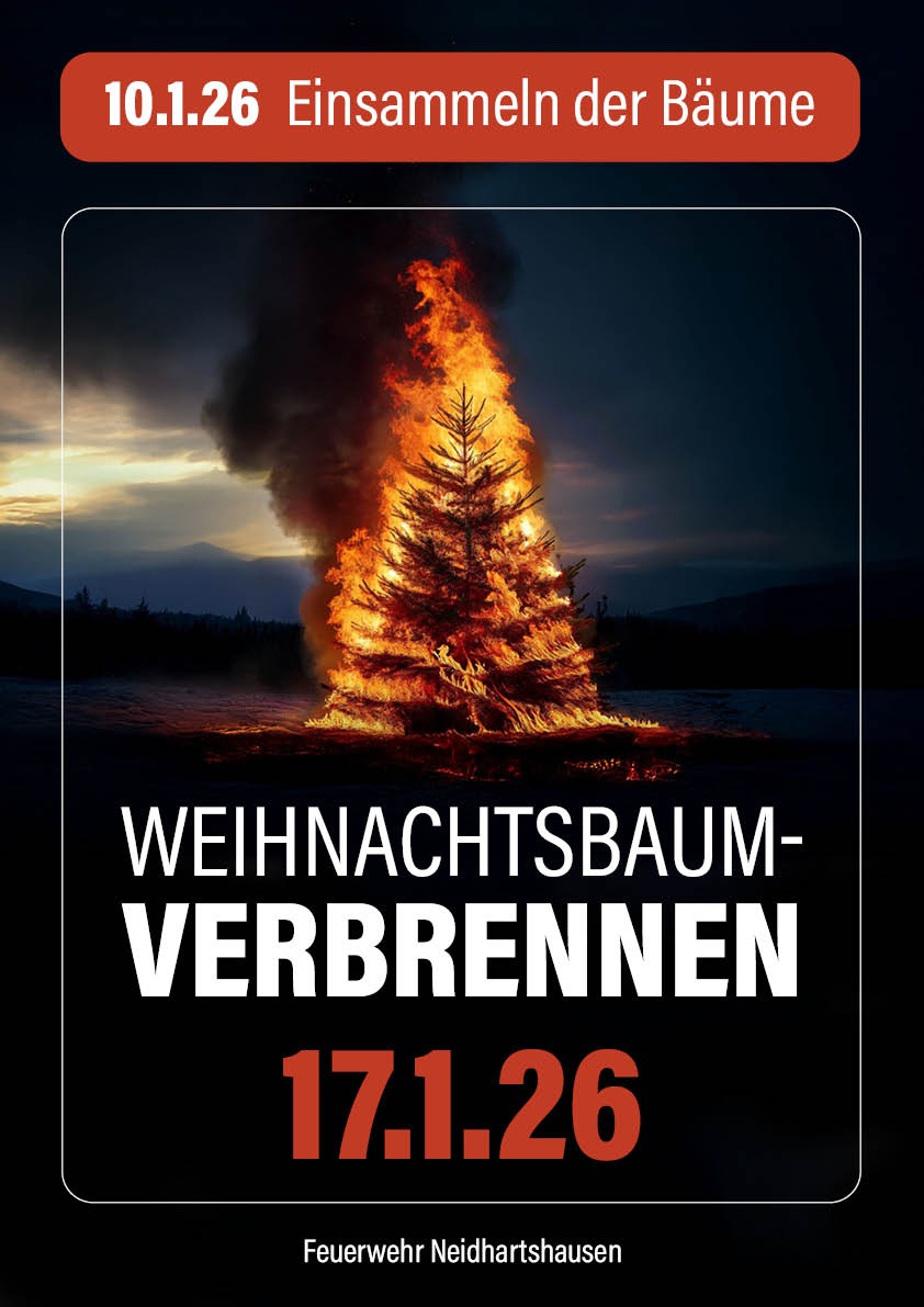 Der gesellige Abschluss findet am 17. Januar2026 ab 16:30Uhr am Gerätehaus in Neidhartshausen statt. Dort wird die gesammelte Baumverbrennung als Highlight des Tages zelebriert. Bei wärmenden Flammen, gemütlicher Atmosphäre und guter Gesellschaft ist auch für das leibliche Wohl bestens gesorgt.