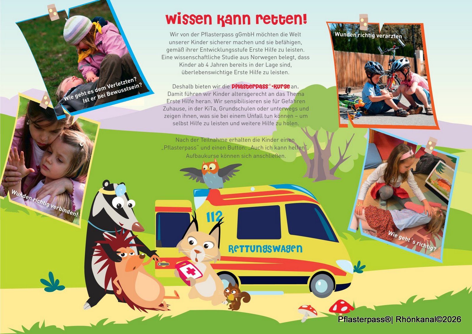 Die Kurse tragen das Motto „Pflasterpass® Wissen kann Leben retten®!“ und stehen unter dem Leitgedanken, Unfallprävention und Erste-Hilfe-Maßnahmen auf spielerische Weise für Kinder verständlich zu machen.