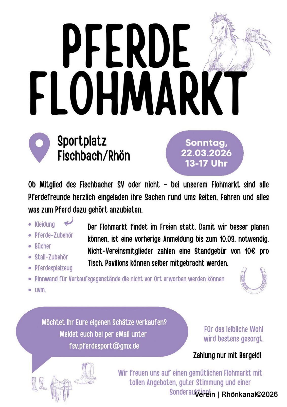 Der Fischbacher SV Sektion Pferdesport führt am Sonntag, den 22. März 2026 von 13 bis 17 Uhr auf dem Sportplatz in Fischbach einen Pferdeflohmarkt durch.