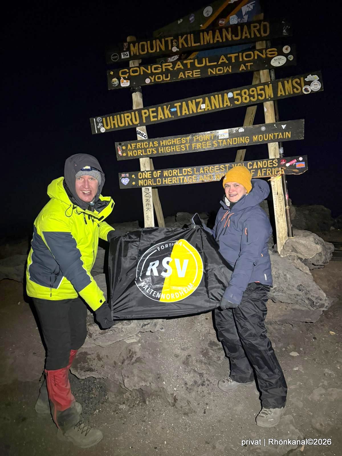 Auf beeindruckenden 5.895 Metern Höhe am Uhuru Peak, bei eisiger Kälte, dünner Luft und nach einem kräftezehrenden Aufstieg, präsentierte er die Fahne der RSV Fortuna – sichtbar, stolz und mit einem Lächeln, das mehr sagt als tausend Worte. Dieses Bild steht für Durchhaltevermögen, Willenskraft und echte Verbundenheit zum Verein.