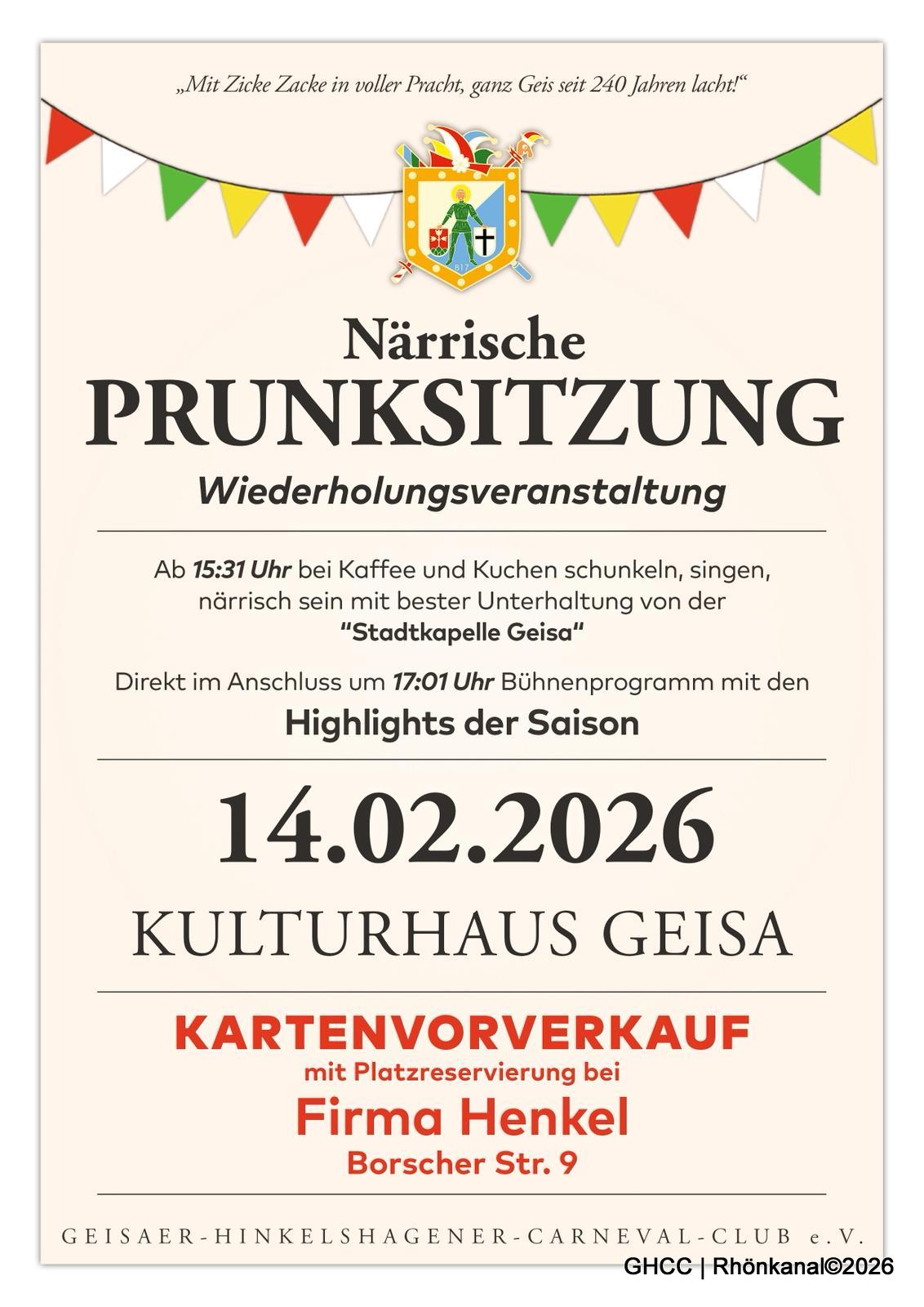 Die große Prunksitzung des GHCC Geisa findet dann am Samstag ab 17.01 Uhr statt. Hier werden die Highlights der Saison auf die Bühne gebracht.