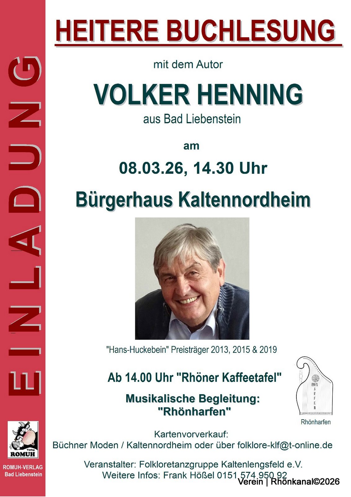 Am Sonntag, den 8. März 2026, lädt die Folkloretanzgruppe Kaltenlengsfeld e.V. zu einer heiteren Buchlesung ins Bürgerhaus Kaltennordheim ein.