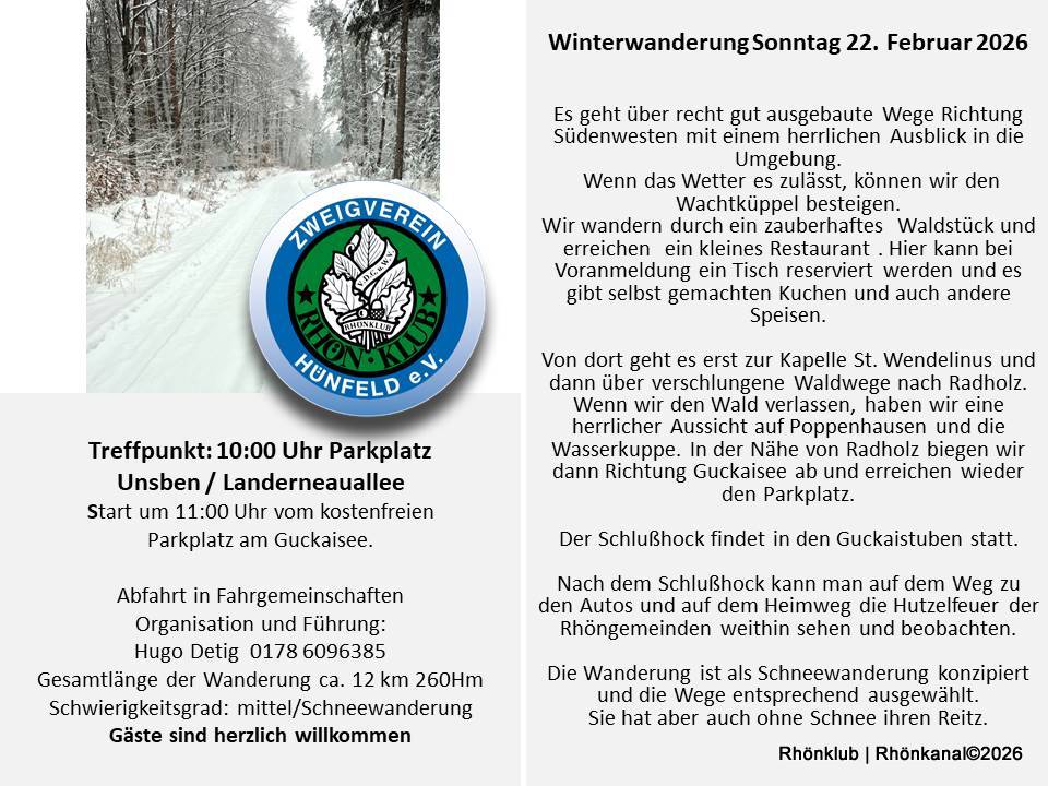 Am Sonntag, den 22. Februar 2026, lädt der Rhönklub Zweigverein Hünfeld herzlich zur Winterwanderung ein. Es geht über recht gut ausgebaute Wege Richtung Südenwesten mit einem herrlichen Ausblick in die Umgebung.