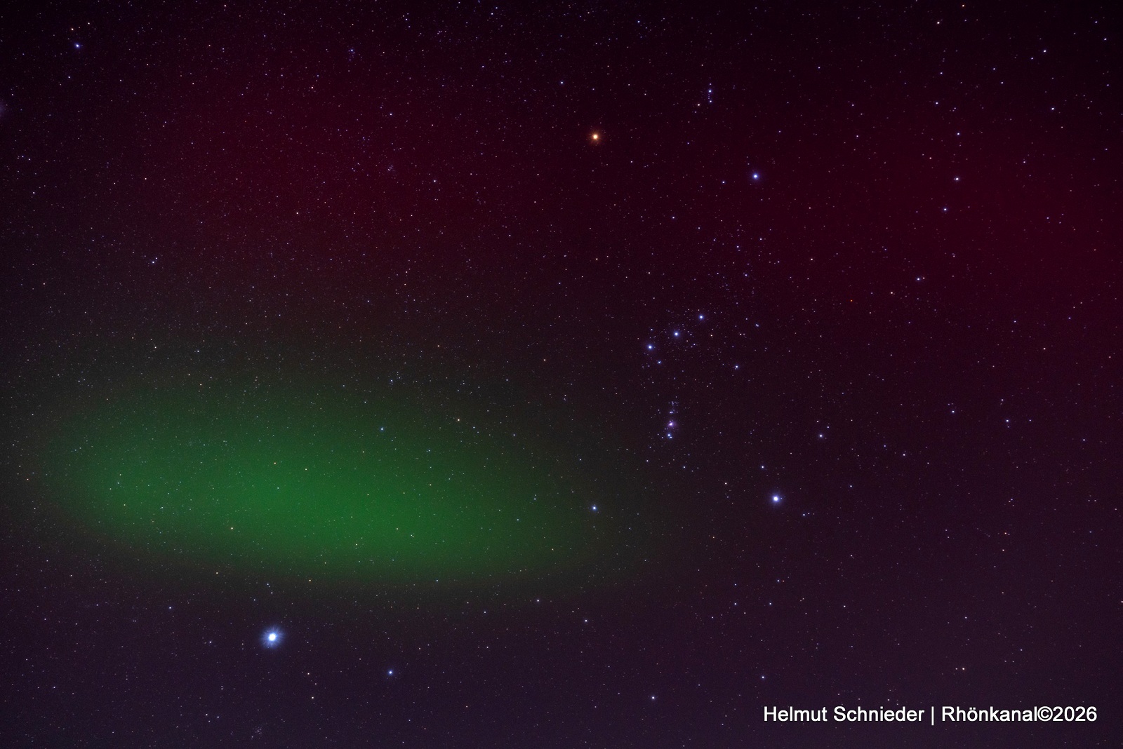 Und die Linie vom Mittelstern des Gürtels über den Stern zwischen Beteigeuze und Bellatrix führt fast direkt zu Capella, dem hellsten Stern im Sternbild Fuhrmann, fast im Zenit.