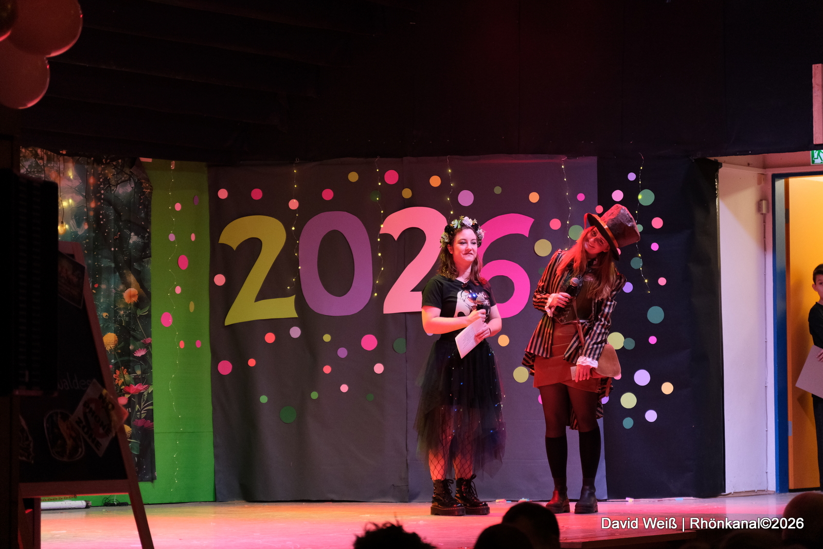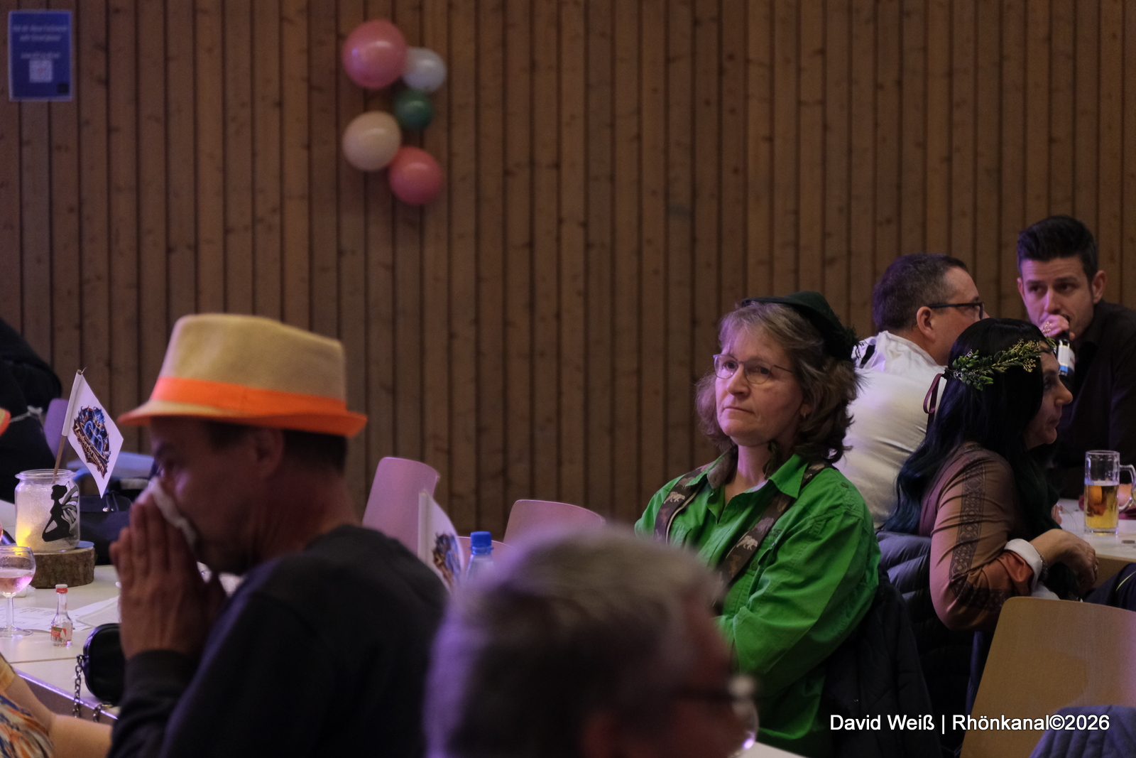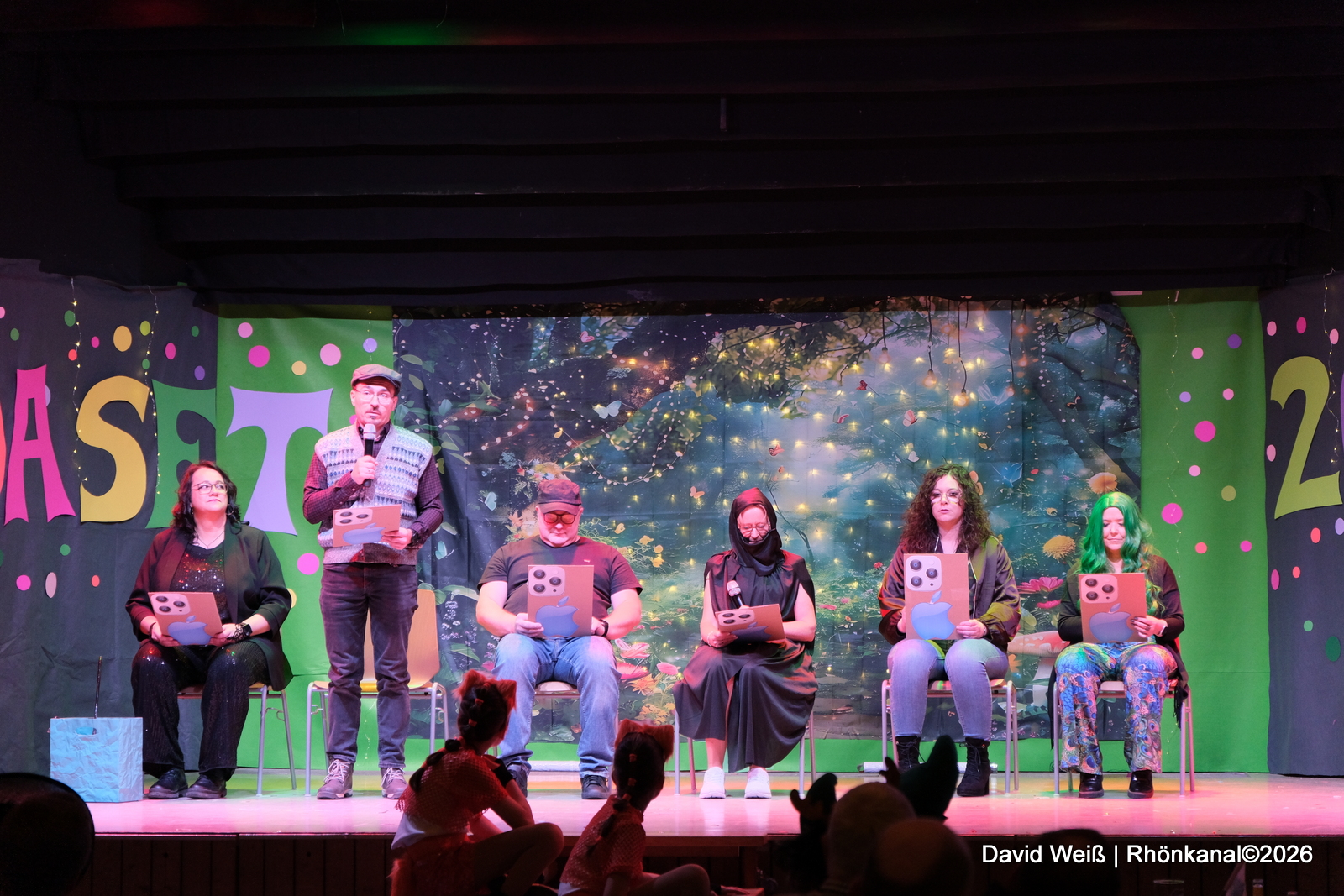 Beim Programmpunkt „Dorfgeschehen“ wurde das Publikum über aktuelle und vergangene Ereignisse im Ort informiert. So ging es unter anderem um eine Geburtstagsparty, die mit Autoreifen endete, die die Straße hinunterrollten, oder um eine verschlossene Tür an Heiligabend und eine abendliche Rettungsaktion.