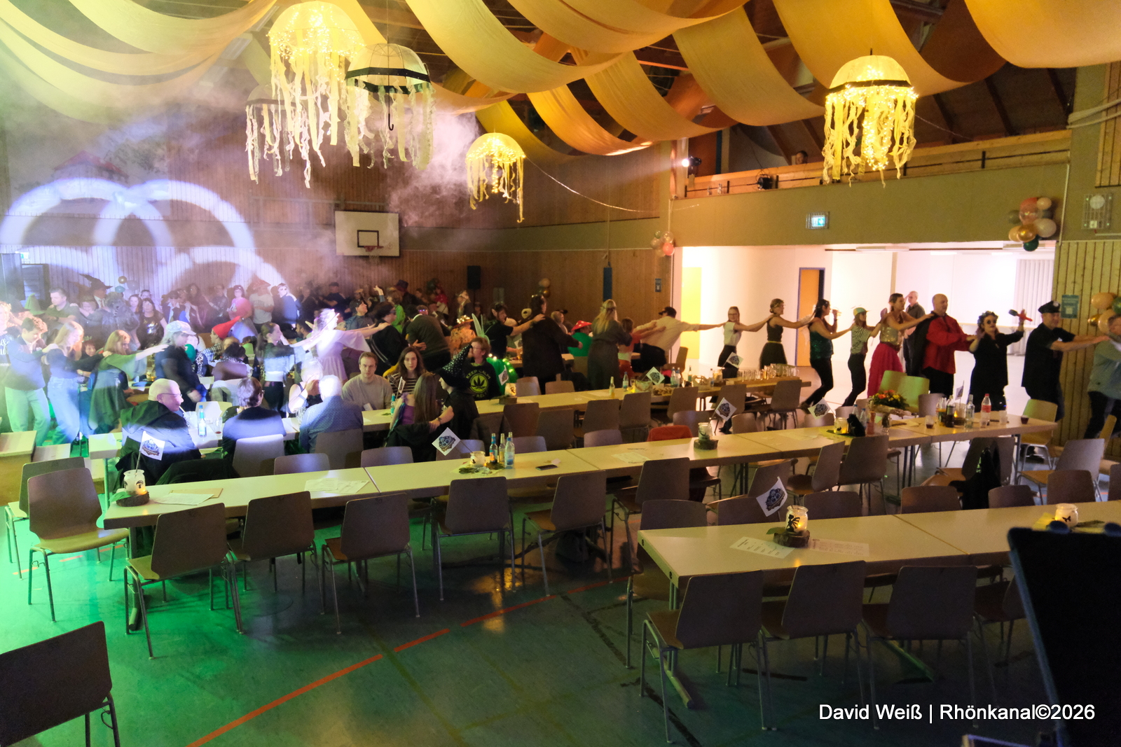Mit einer Polonaise zog das Publikum ausgelassen durch die Halle. Rundum war es ein gelungener Abend – aus Sicht der Veranstalter, der aufgetretenen Tanzgruppen und des Publikums.