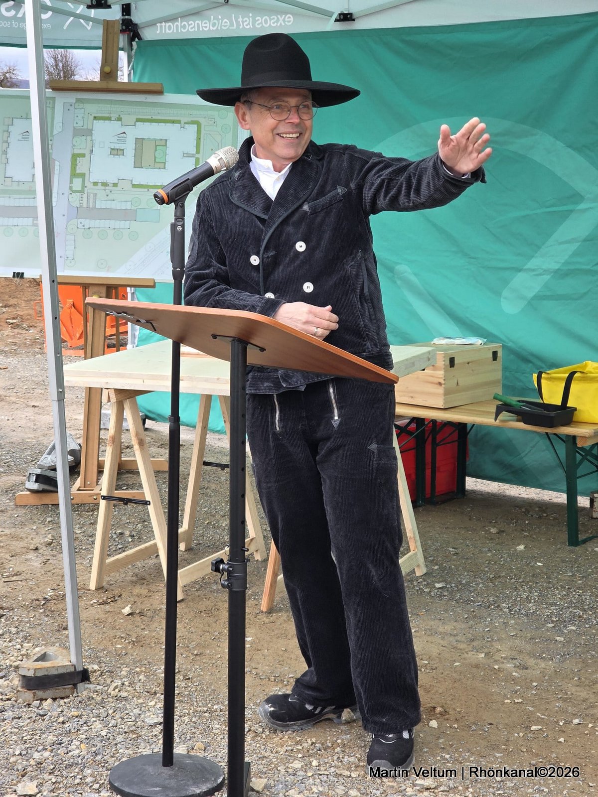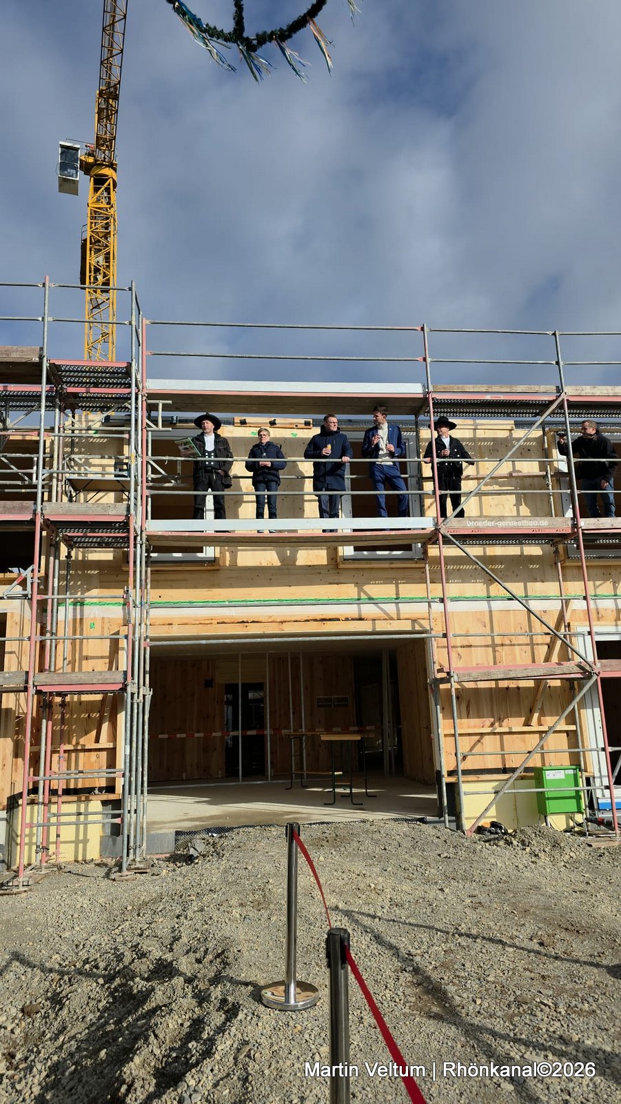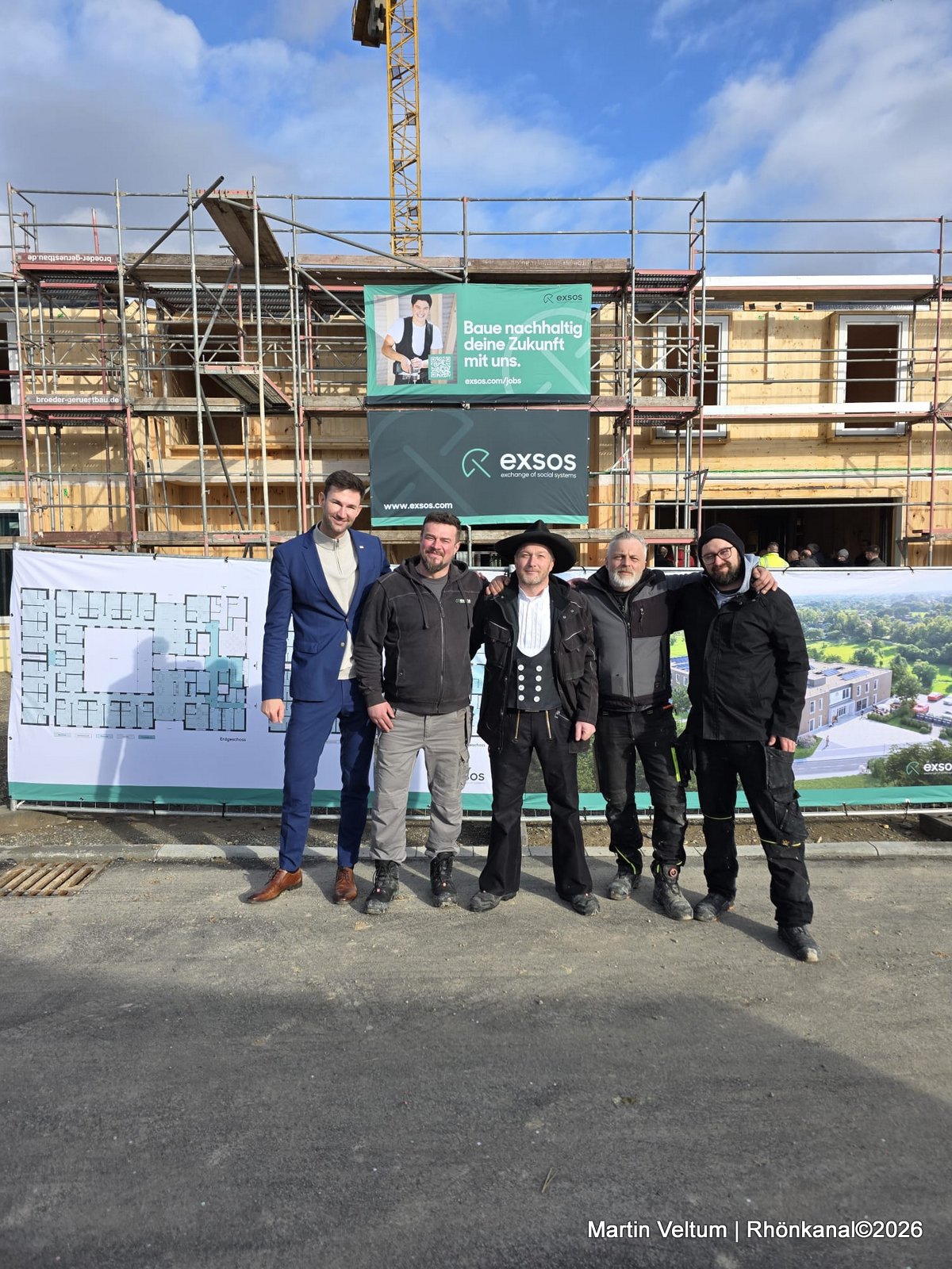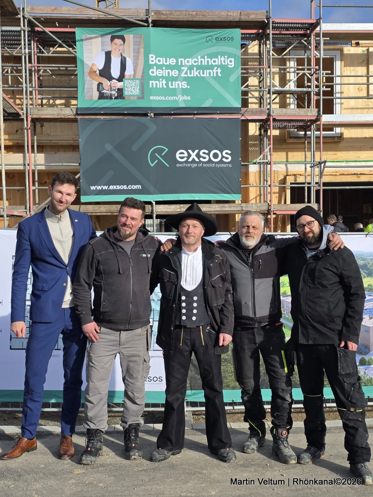 In seiner Begrüßung trat Thoralf Bäring, Geschäftsführer der exsos GmbH, in traditioneller Zimmermannstracht auf und würdigte die Arbeit aller Beteiligten: „Als gelernter Zimmermann weiß ich, was hier täglich geleistet wird. Wichtig ist mir vor allem: Der Bau verläuft unfallfrei, planmäßig und im Zeitrahmen. Genau so soll es sein.“