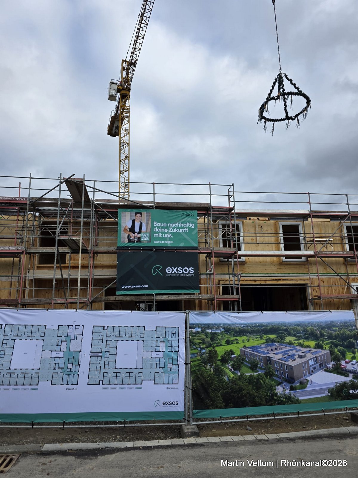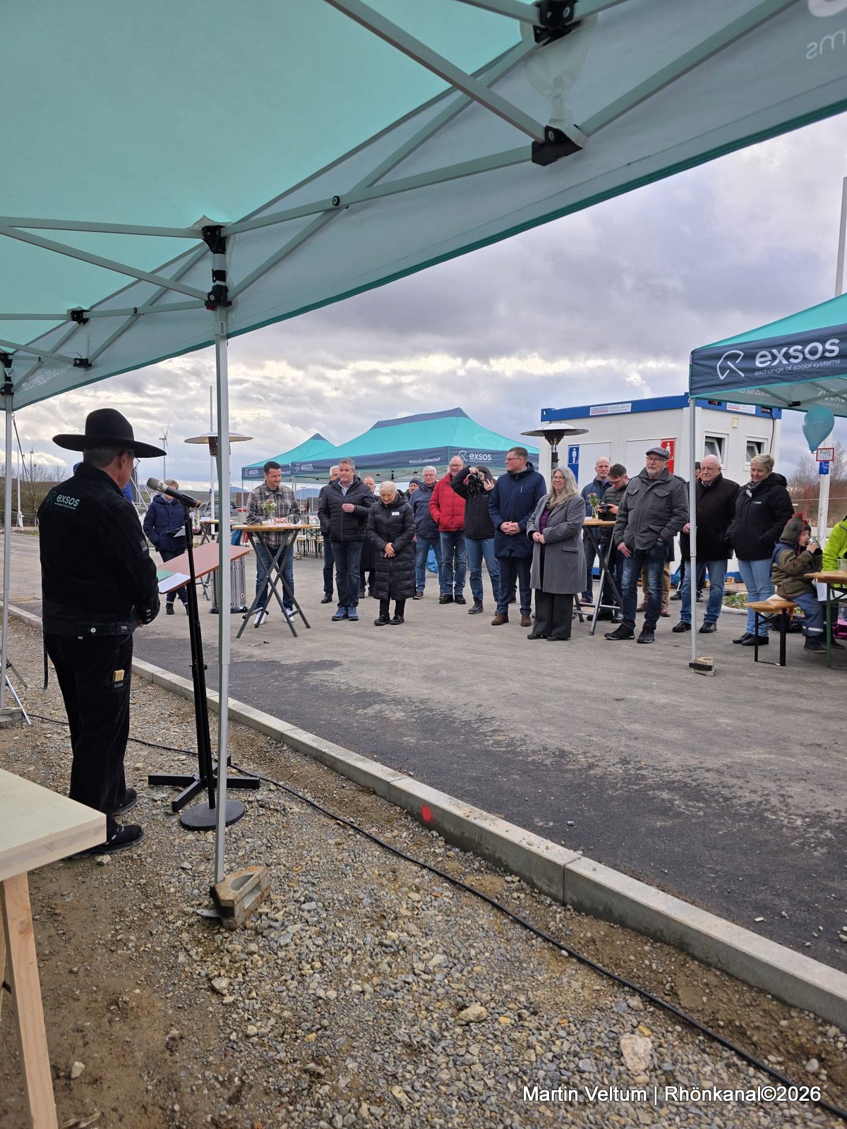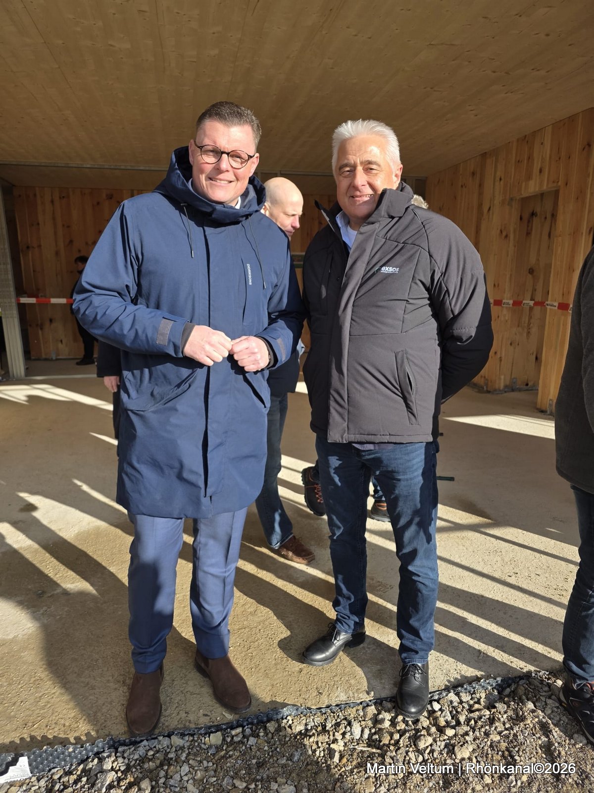 In seiner Begrüßung trat Thoralf Bäring, Geschäftsführer der exsos GmbH, in traditioneller Zimmermannstracht auf und würdigte die Arbeit aller Beteiligten: „Als gelernter Zimmermann weiß ich, was hier täglich geleistet wird. Wichtig ist mir vor allem: Der Bau verläuft unfallfrei, planmäßig und im Zeitrahmen. Genau so soll es sein.“