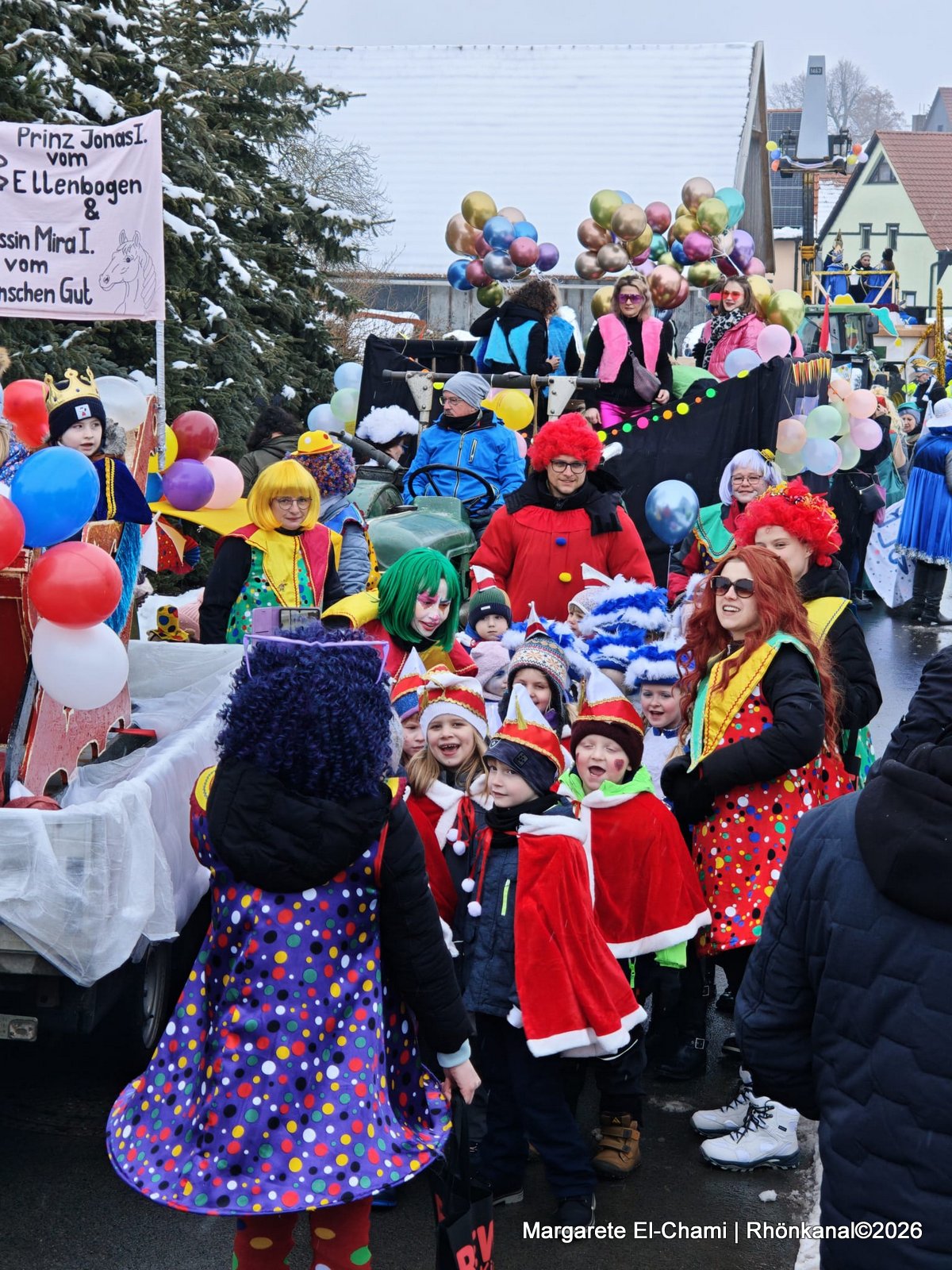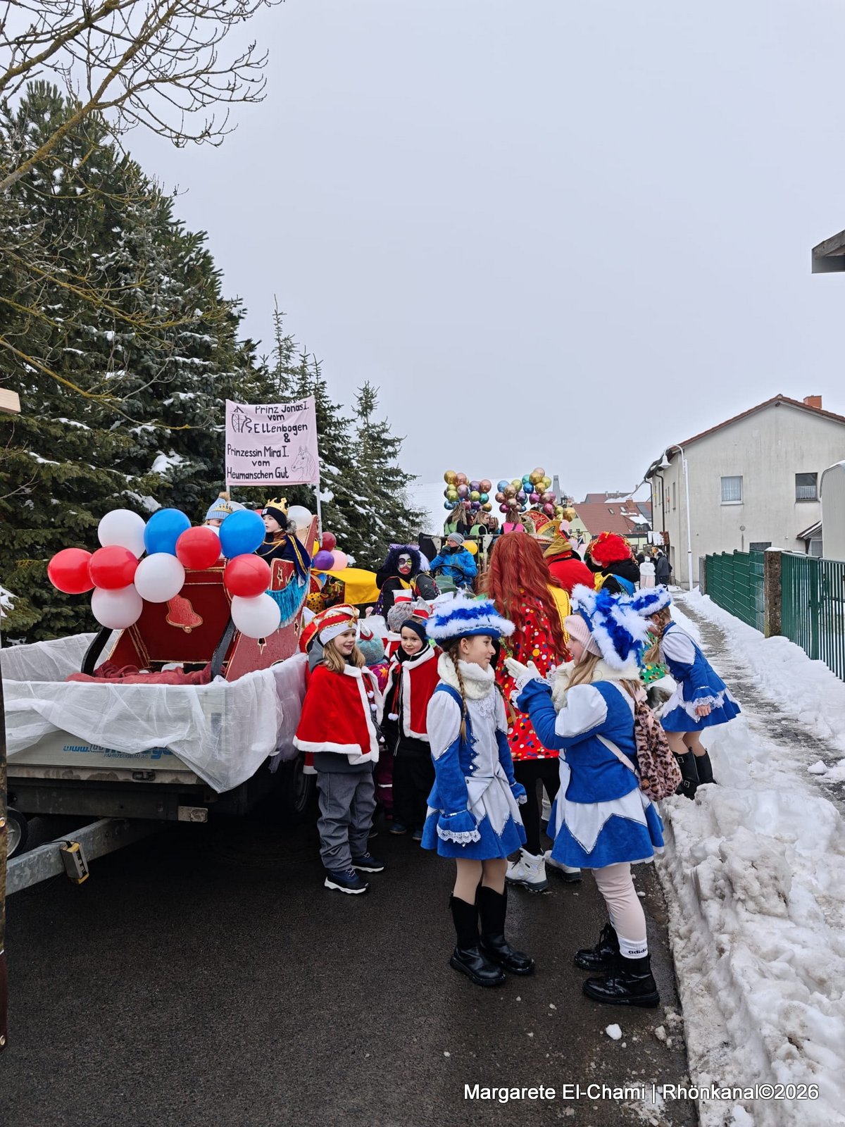 Dazu wurde im Kindergarten ein eigener kleiner Kinderverein gegründet, mit Karnevals-Präsident und -Präsidentin, dem Prinzenpaar Jonas I vom Ellenbogen und Mira I vom Heumannschen Gut, die beim Umzug im Schlitten gezogen wurden, und natürlich dem Kinderelferrat.