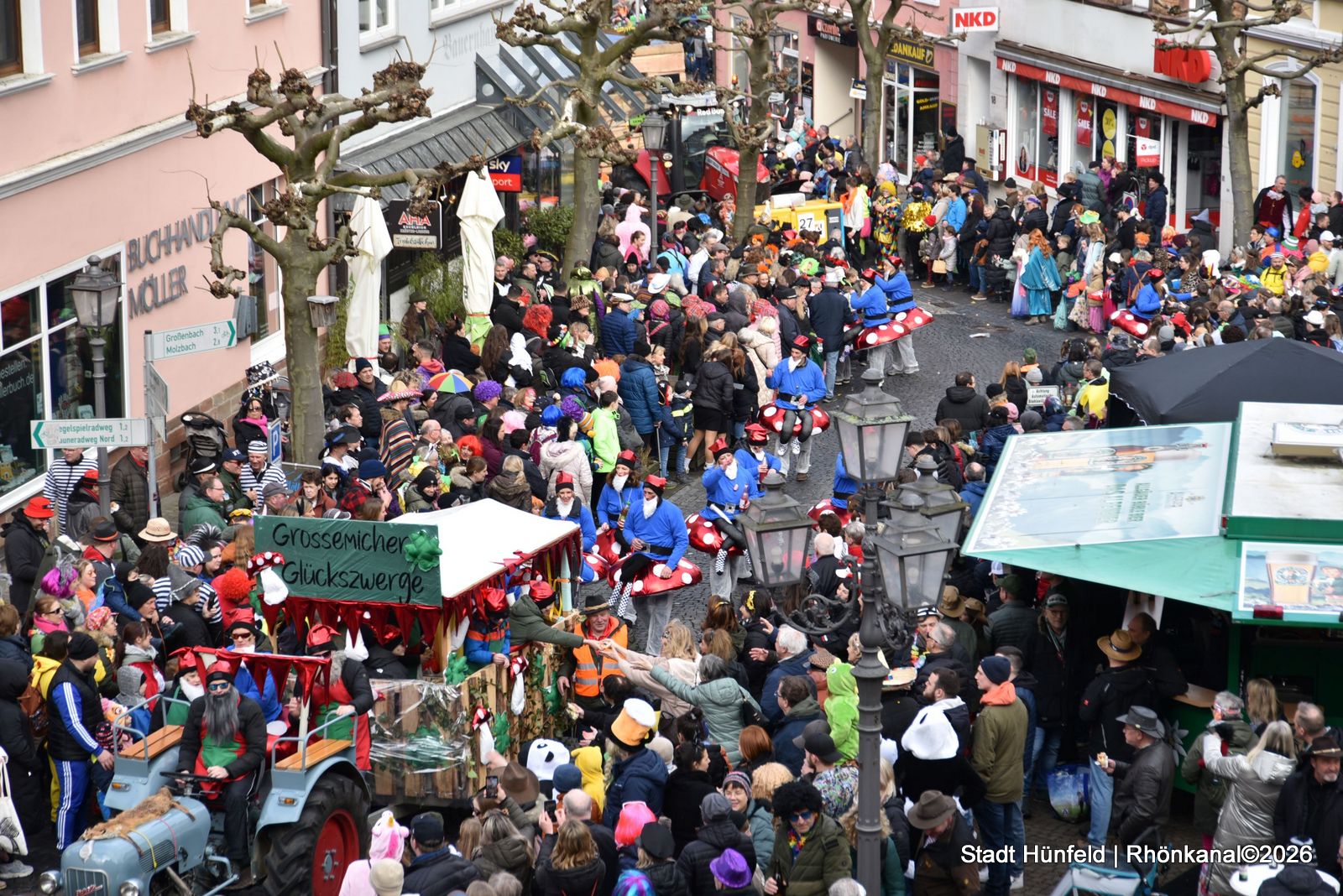 Die Hünfelder Karnevalsgesellschaft ist als Mitveranstalter mit fünf Fußgruppen und der traditionellen Birne auf dem Elferratswagen dabei. Am Schluss des Zuges fährt wie immer der Magistrats-Romo-Wagen mit den Stadträtinnen und Stadträten.