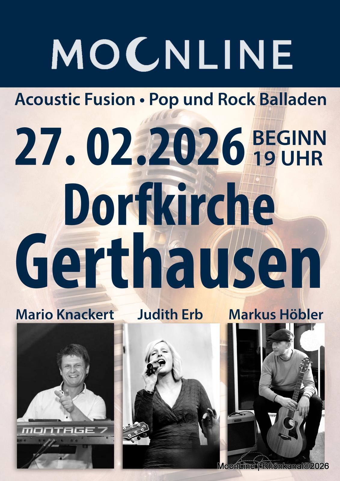 Ab 19 Uhr verwandelt das Akustik-Trio MOONLINE, um Sängerin Judith Erb, Gitarrist Markus Höbler und Mario Knackert am Piano, mit gefühlvollen und zeitlosen Interpretationen bekannter Songs, die Gerthäuser Kirche zu einem Raum, der Platz für Emotionen und Zwischentöne gibt.