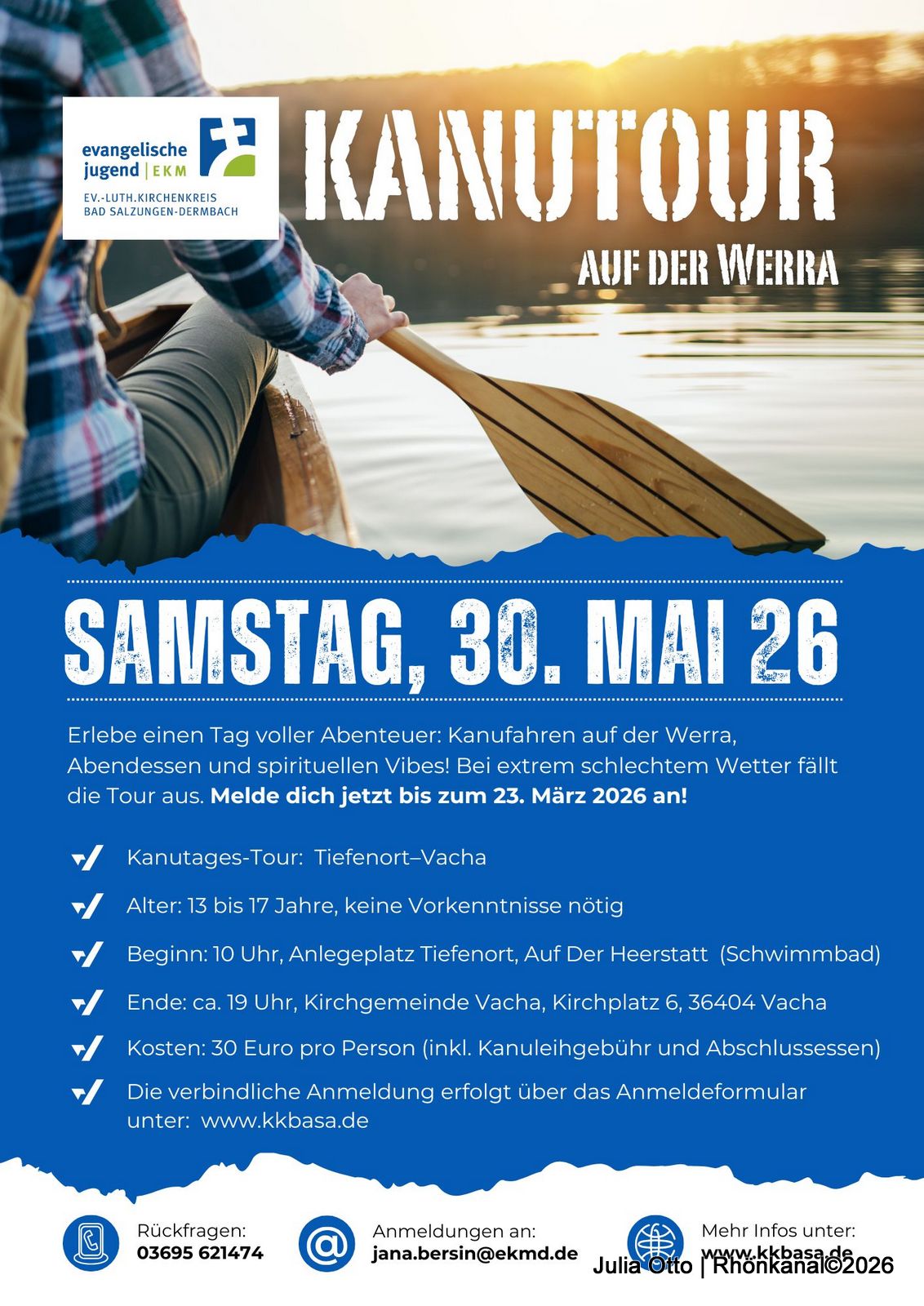 Der Kirchenkreis Bad Salzungen-Dermbach lädt alle Jugendlichen von 13 bis 17 Jahren (keine Vorkenntnisse erforderlich) zu einer Kanu-Tagestour ein!