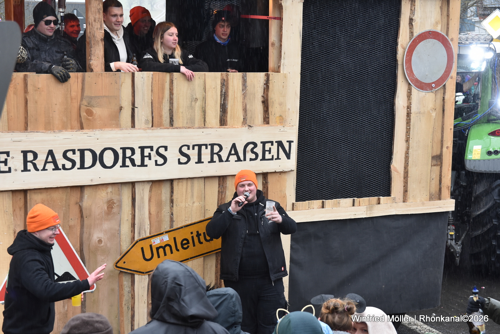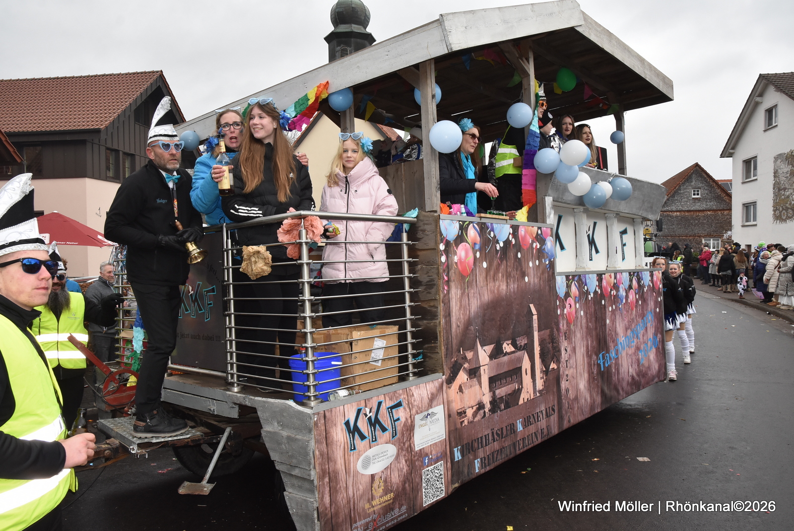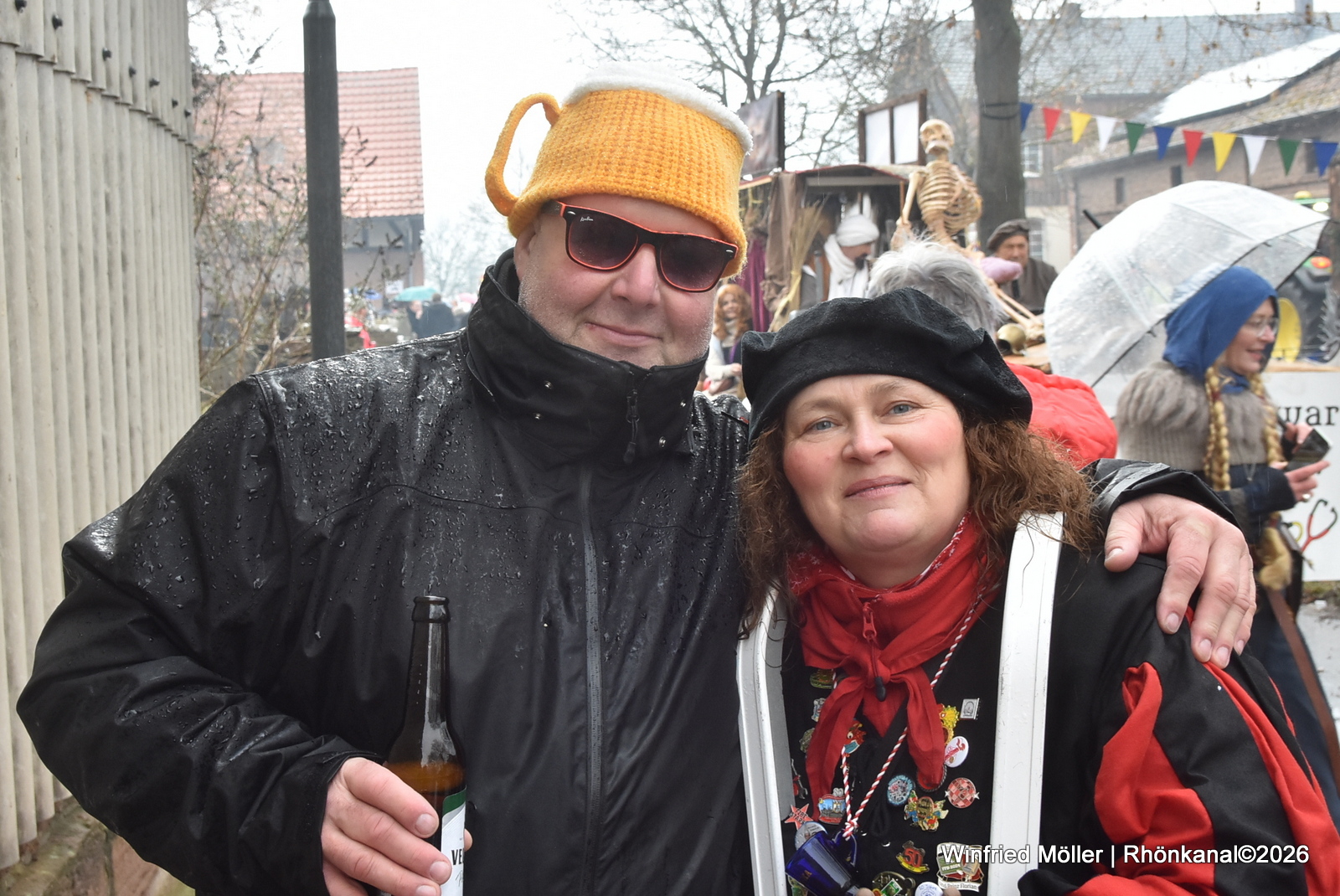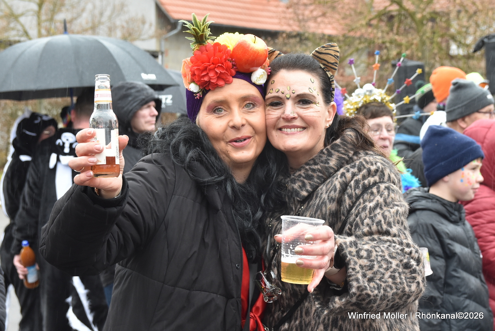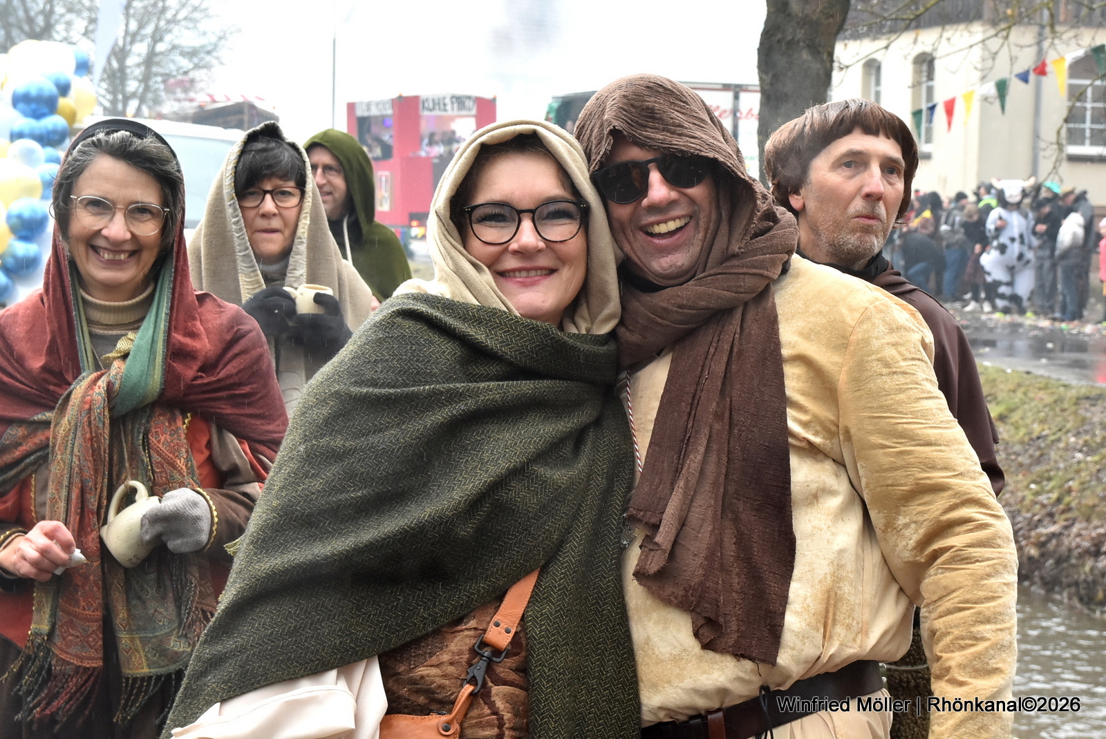 Trotz nasskalter Temperatur und einsetzendem starken Regen ließen es sich die 37 Fußgruppen und Motivwagen nicht nehmen, eine zweite Runde, um den mit Wimpeln geschmückten Grüsselbach zu drehen.