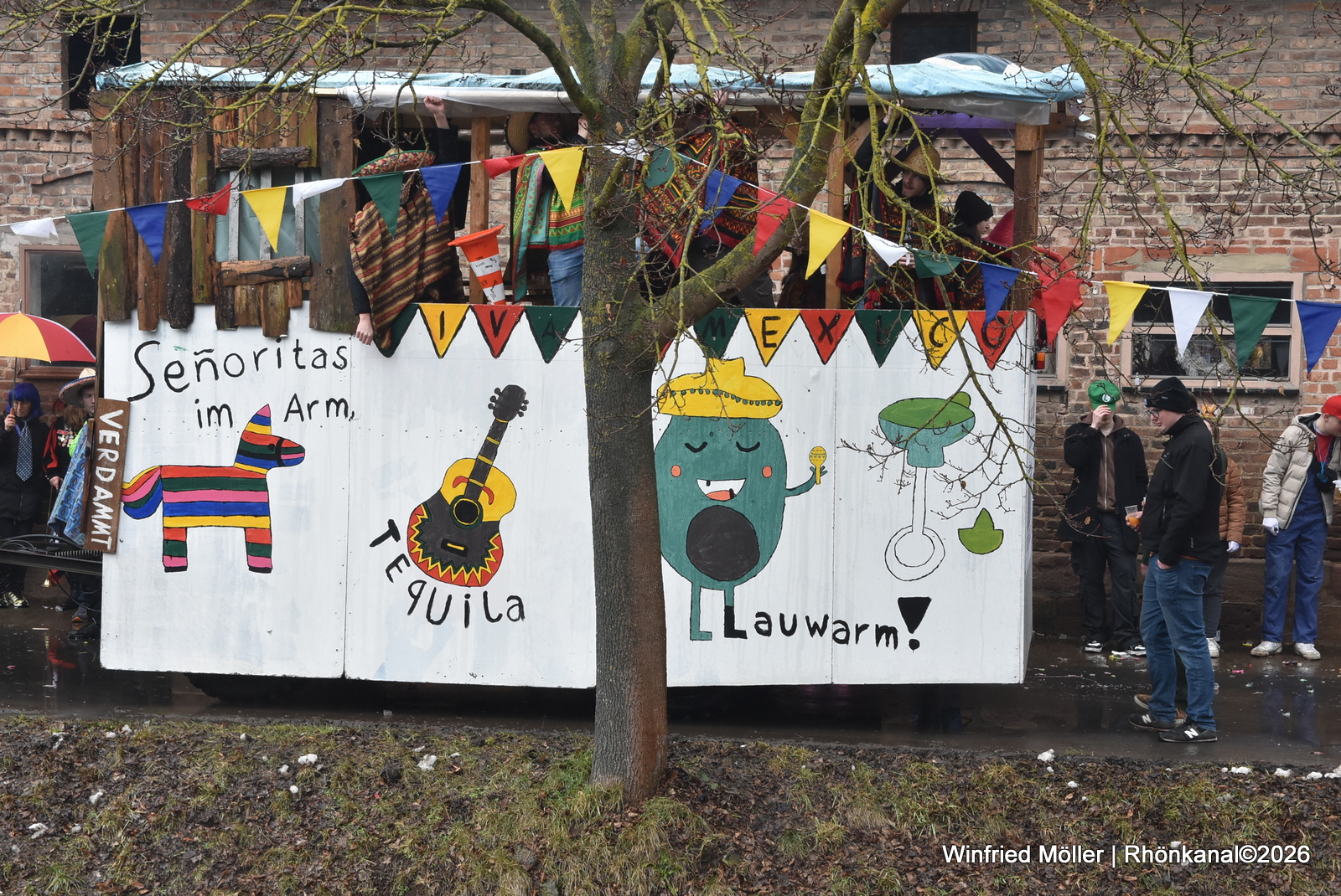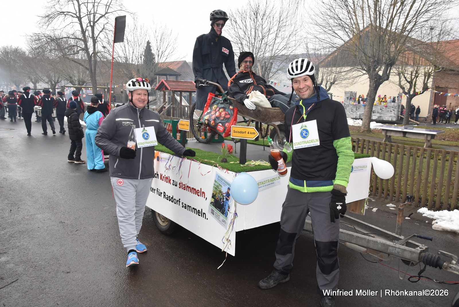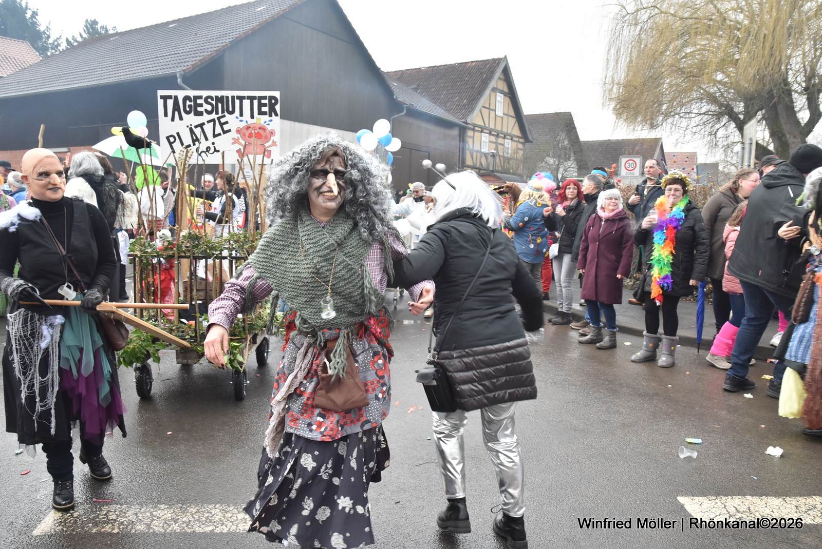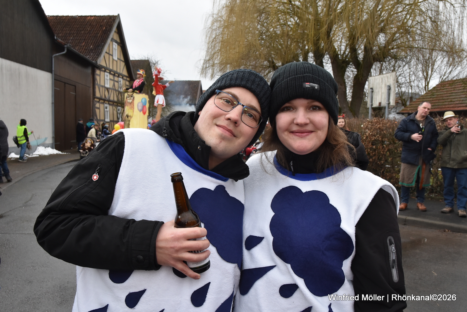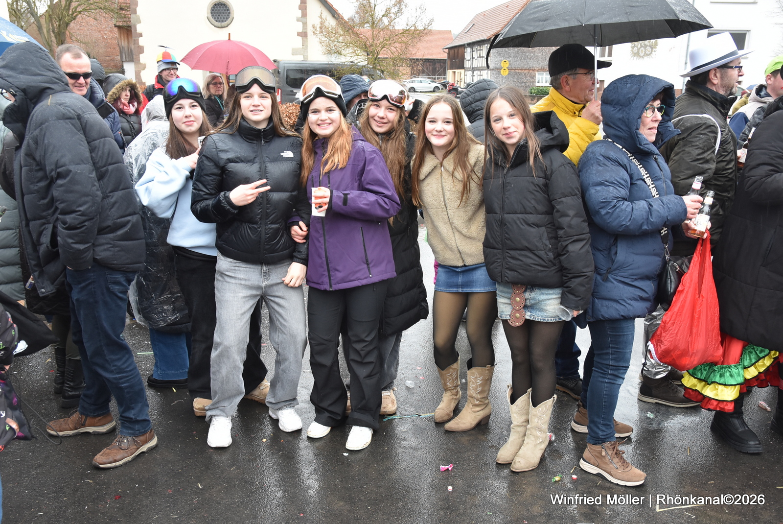 Trotz nasskalter Temperatur und einsetzendem starken Regen ließen es sich die 37 Fußgruppen und Motivwagen nicht nehmen, eine zweite Runde, um den mit Wimpeln geschmückten Grüsselbach zu drehen.