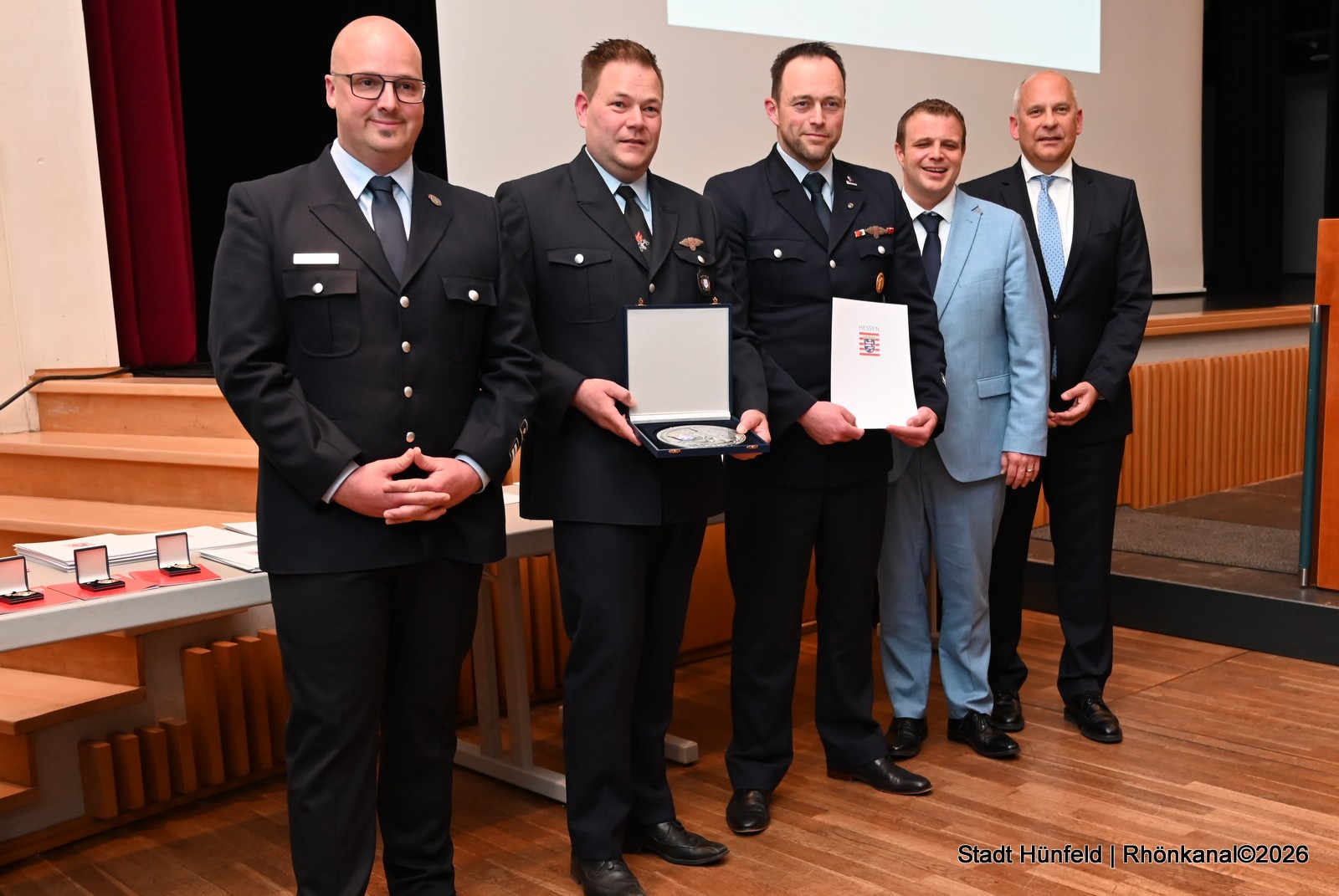 Die gute Zusammenarbeit mit den Hünfelder Wehren würdigten DRK-Kreisgeschäftsführer Stefan Bott, Christoph Besse für die Bundespolizei, Kreisbrandmeister Pascal Möller und Markus Niewelt vom Kreisfeuerwehrverband.