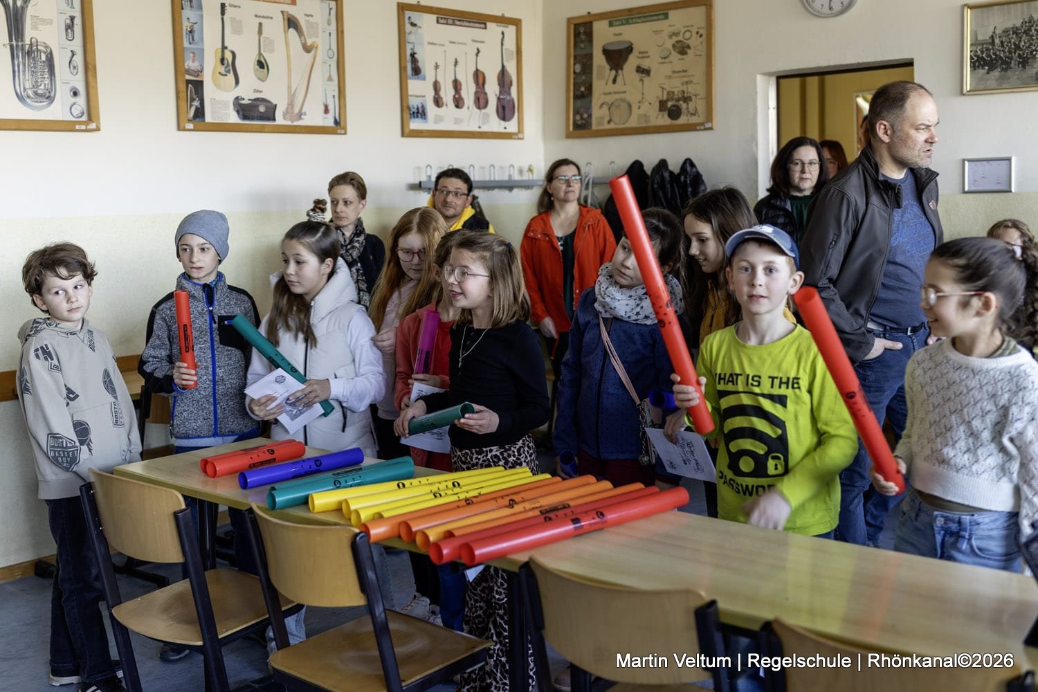 Im gut ausgestatteten Musikraum durften die kleinen Musikerinnen und Musiker an einem interaktiven „Play-Along“ teilnehmen, bei dem gemeinsames Musizieren im Mittelpunkt stand. Ergänzt wurde das Angebot durch ein digitales Musikquiz im Schulflur.