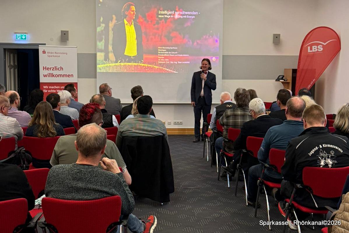 In den Räumlichkeiten der Sparkasse in Meiningen präsentierte der renommierte Energieexperte Prof. Timo Leukefeld innovative Konzepte für energieeffizientes Bauen und Modernisieren unter dem Titel „Intelligent verschwenden“.