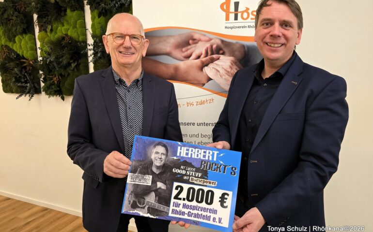 Christof Herbert, 1. Vorsitzender des CSU-Kreisverbandes Rhön-Grabfeld, überreichte Richard Knaier, dem 1. Vorsitzenden des Hospizvereins, eine Spende in Höhe von 2.000 Euro. Der Betrag kam durch eine Sammelaktion beim Konzert „Herbert rockt’s“ am 6. März zustande.