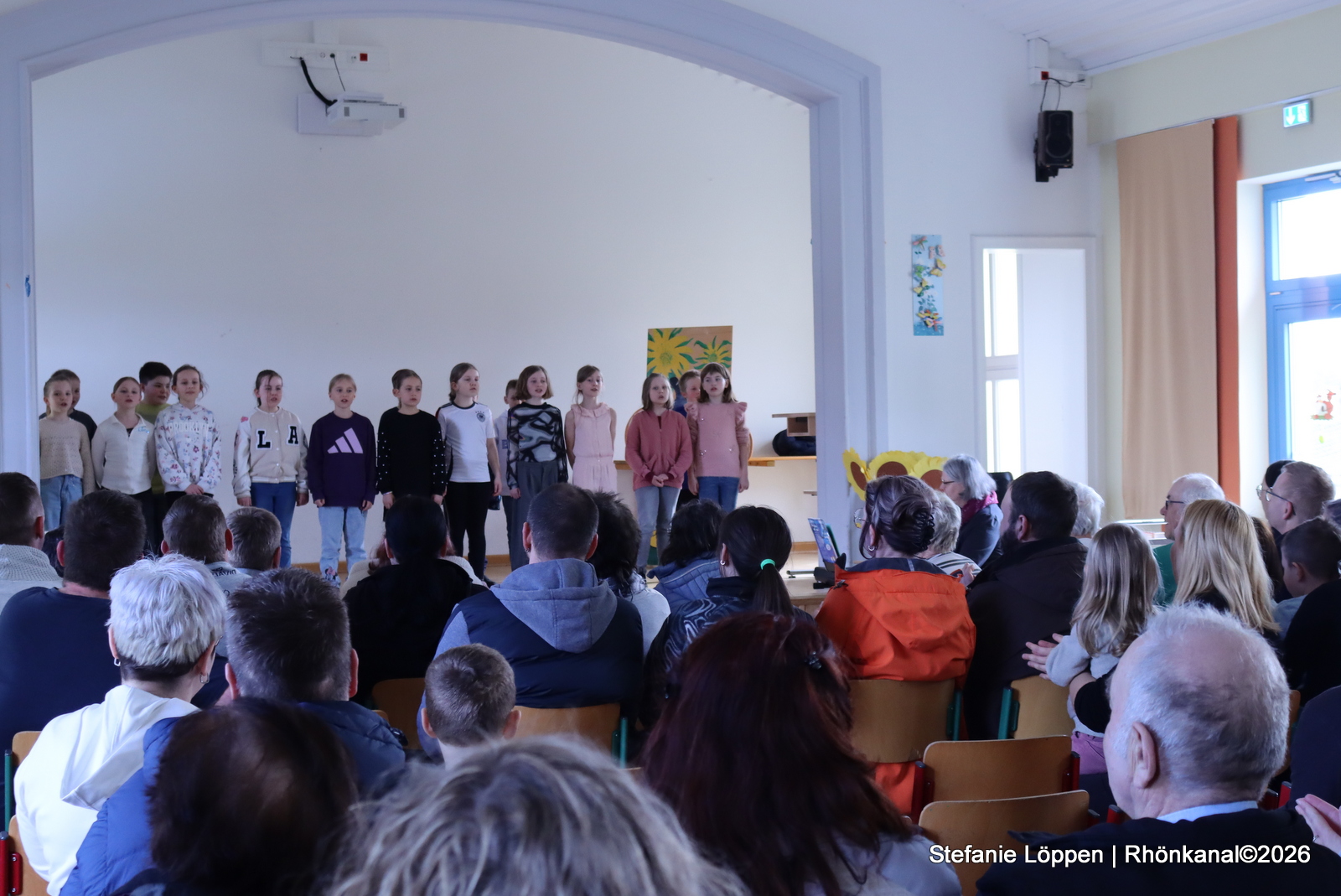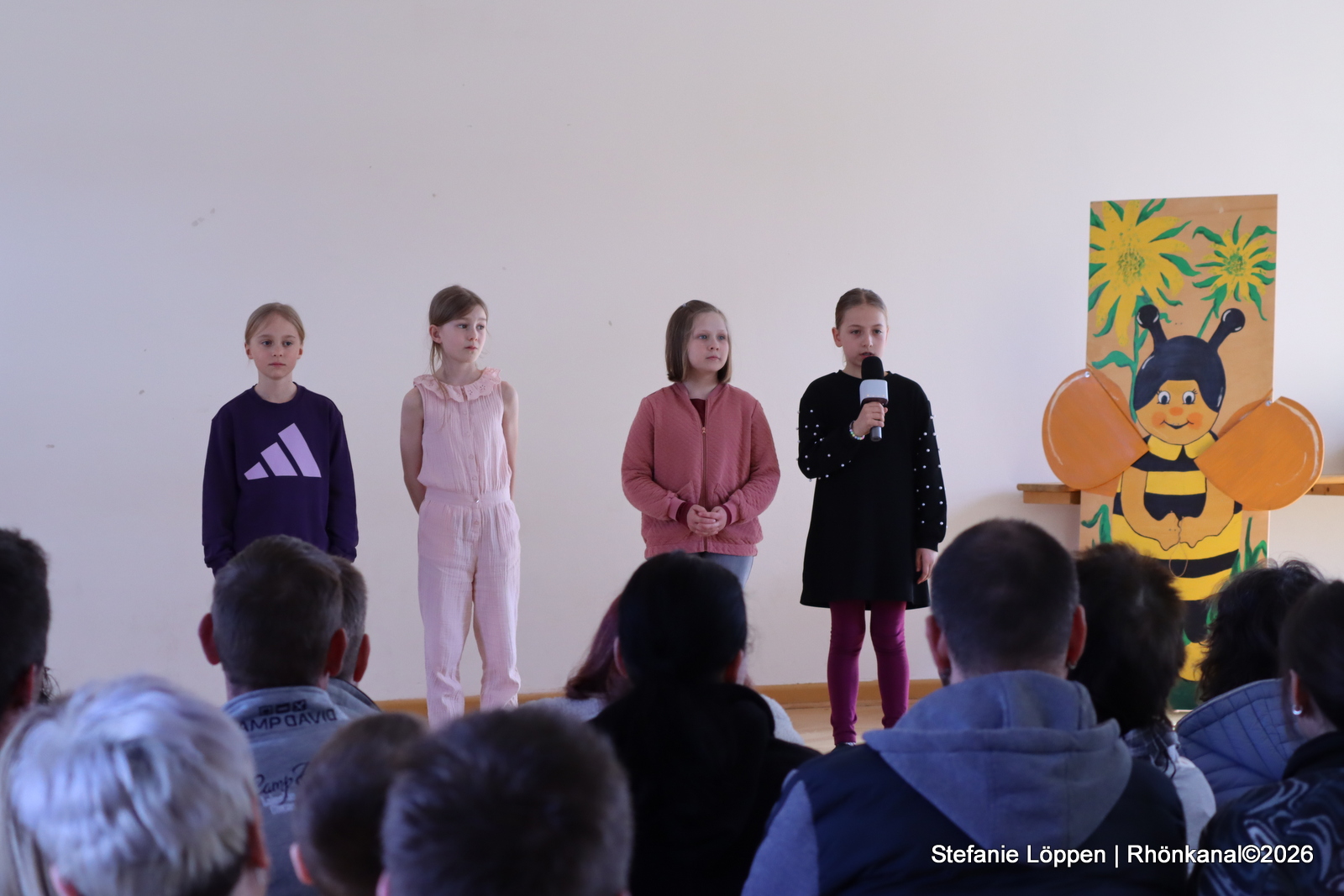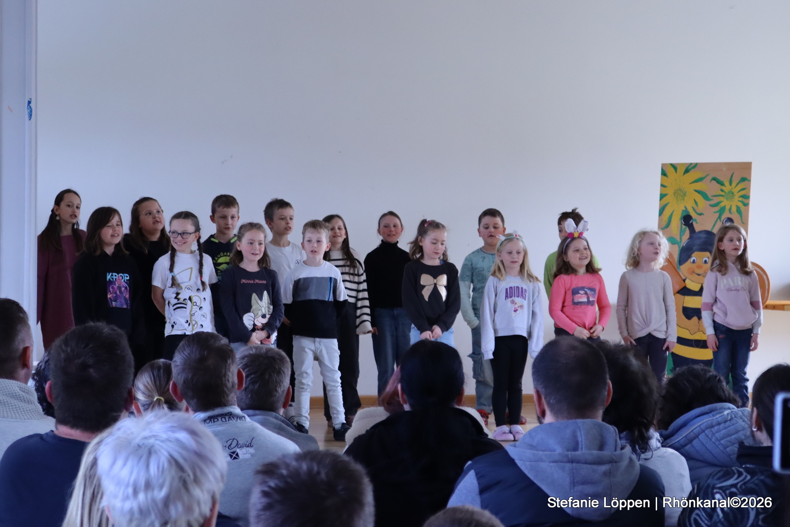 Dann gehörte die Bühne den Schülerinnen und Schülern. Alle Klassen und die Schulband unter der Leitung von Fr. Goerge, hatten etwas vorbereitet: Lieder, Gedichte und ein Streitgespräch zwischen Frühling und Winter, bei dem sich beide Jahreszeiten nichts schenkten. Draußen war es noch kalt genug, dass man beiden Seiten etwas abgewinnen konnte.