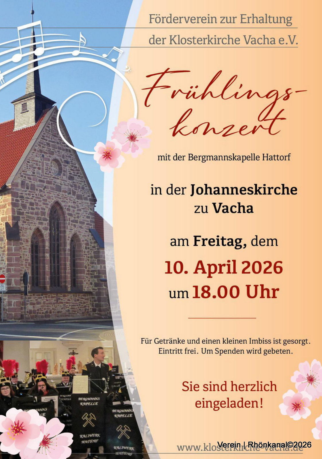 Der Förderverein zur Erhaltung der Klosterkirche e.V. lädt herzlich zum Frühlingskonzert mit der Bergmannskapelle Hattdorf ein. Die Veranstaltung findet am Freitag, den 10. April 2026 in der Johanneskirche Vacha statt.