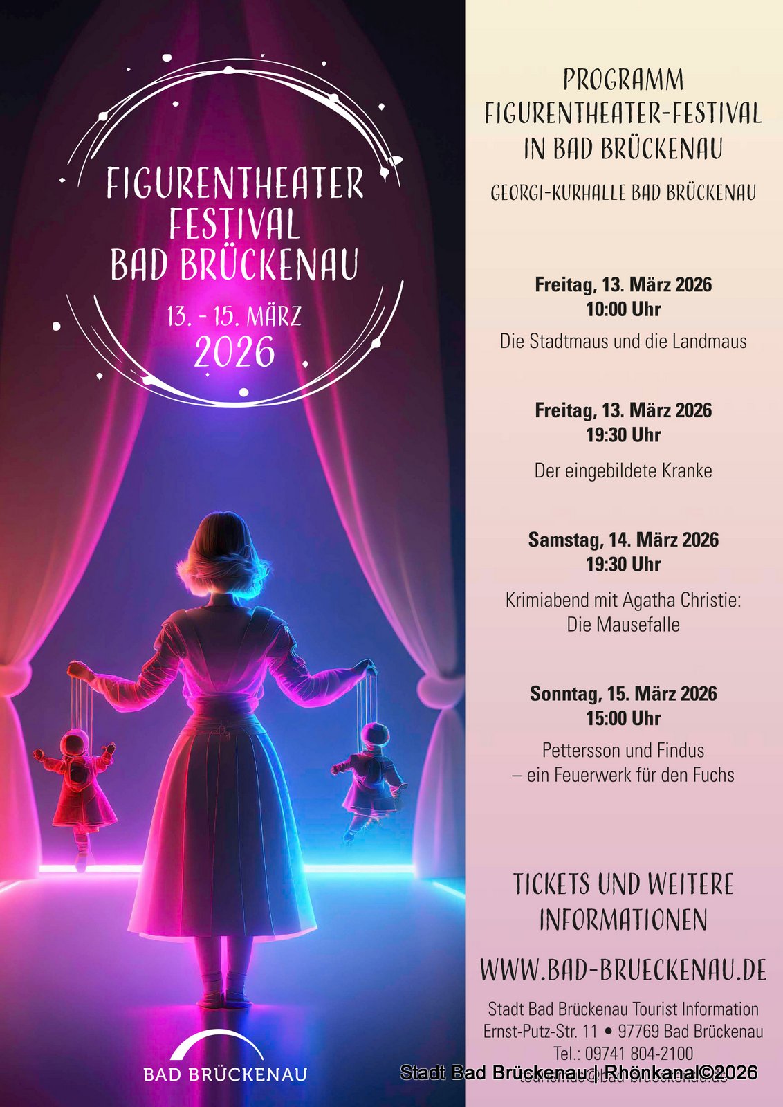Vom 13. bis 15. März 2026 findet in Bad Brückenau zum dritten Mal das Figurentheater-Festival für Klein und Groß statt. Es werden Schauspiel- und Figurentheatervorstellungen sowohl für Kinder als auch für Erwachsene gezeigt.