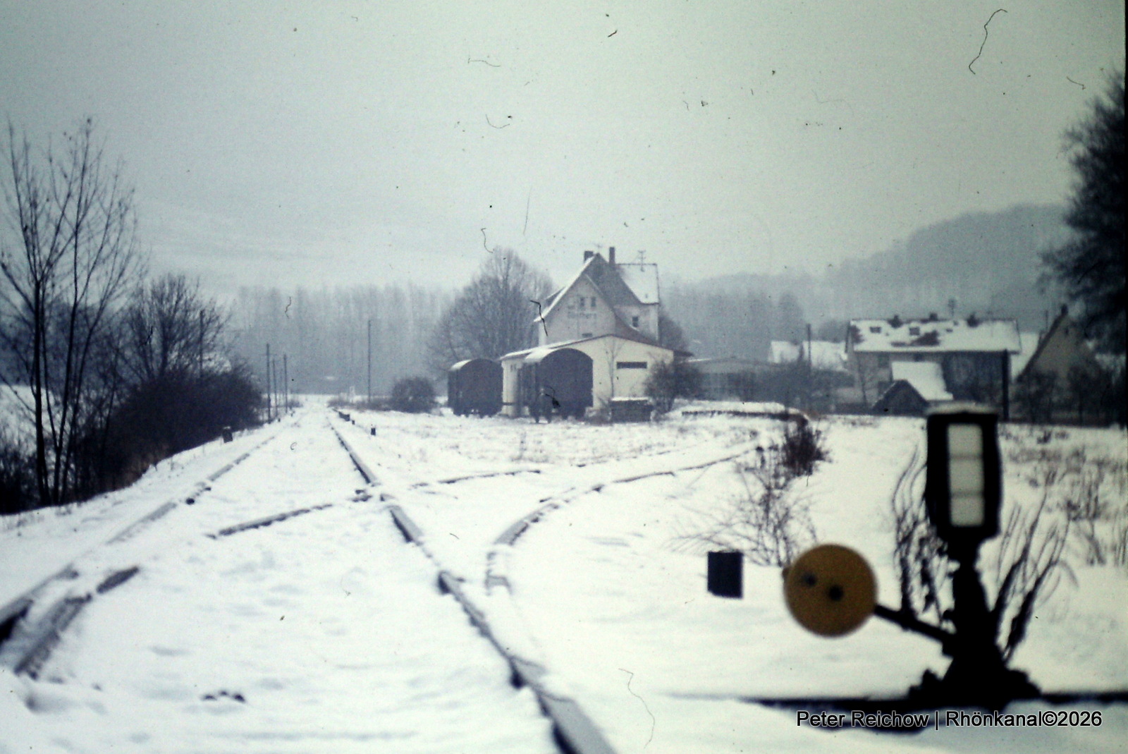 Ende der 1960er Jahre der Bahnhof in Günthers im Winter. Es gibt noch einige Güterkunden.