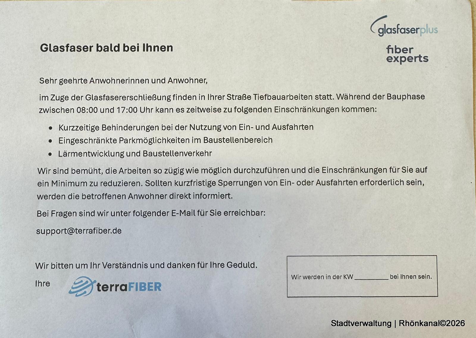 Alle Haushalte in den entsprechenden Straßen erhalten in den nächsten Tagen Informationszettel, die direkt in die Briefkästen eingeworfen werden. Darin werden die nächsten Schritte sowie mögliche Auswirkungen der Bauarbeiten erläutert.