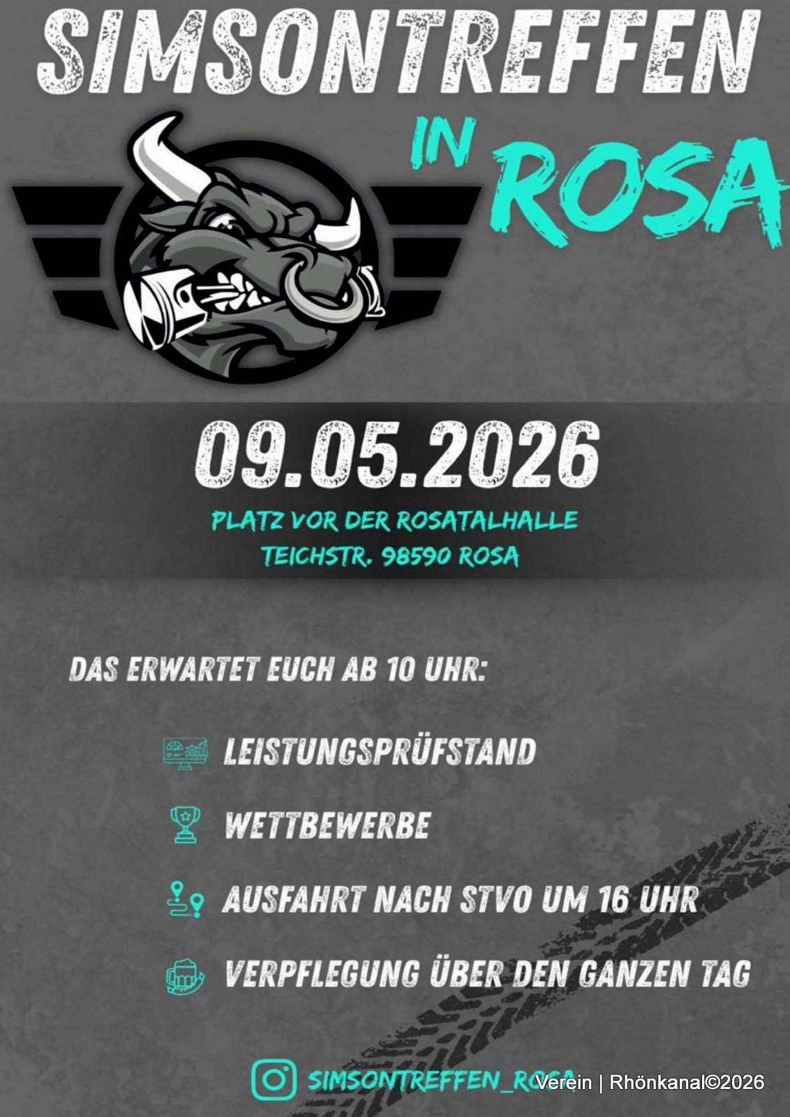 Am Samstag, den 9. Mai 2026, findet vor der Rosatalhalle in Rosa das 4. Simsontreffen statt. Beginn der Veranstaltung ist um 10 Uhr.