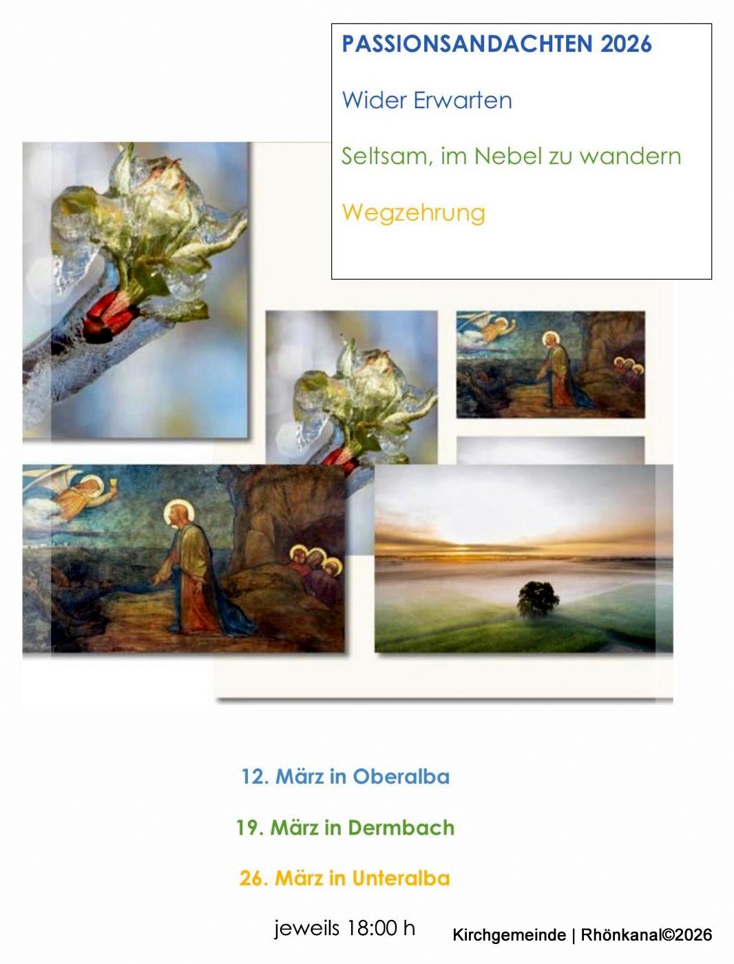 Passend dazu werden moderne geistliche Lieder gesungen. Die Andachten finden am 12. März in Oberalba, am 19. März in Dermbach und am 26. März in Unteralba statt. Beginn ist jeweils um 18 Uhr.
