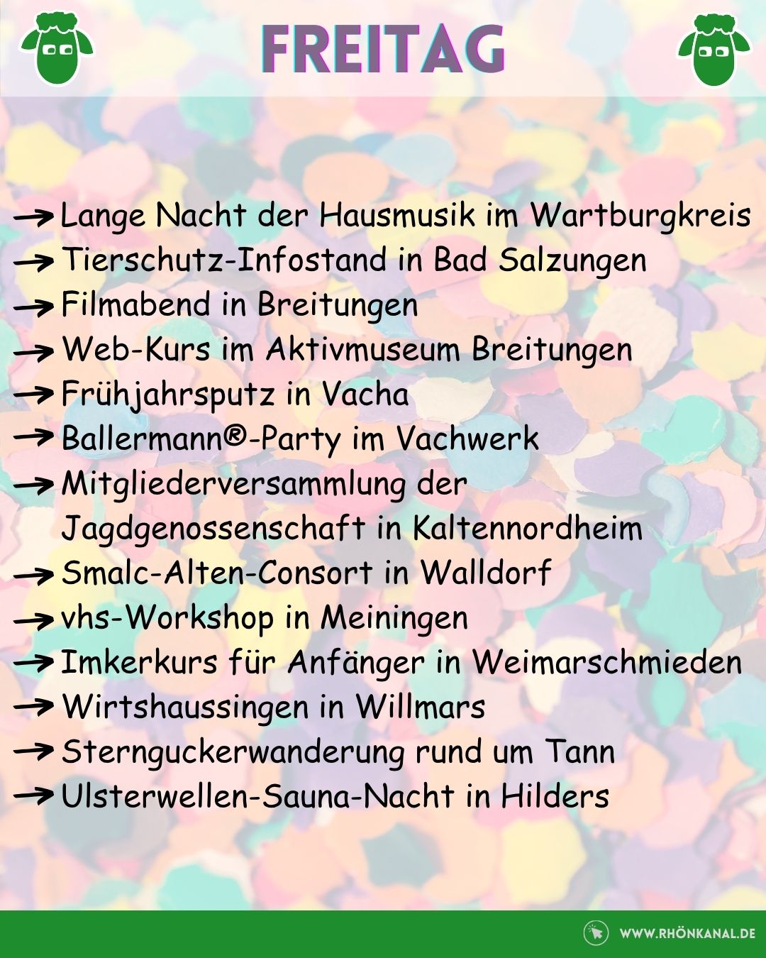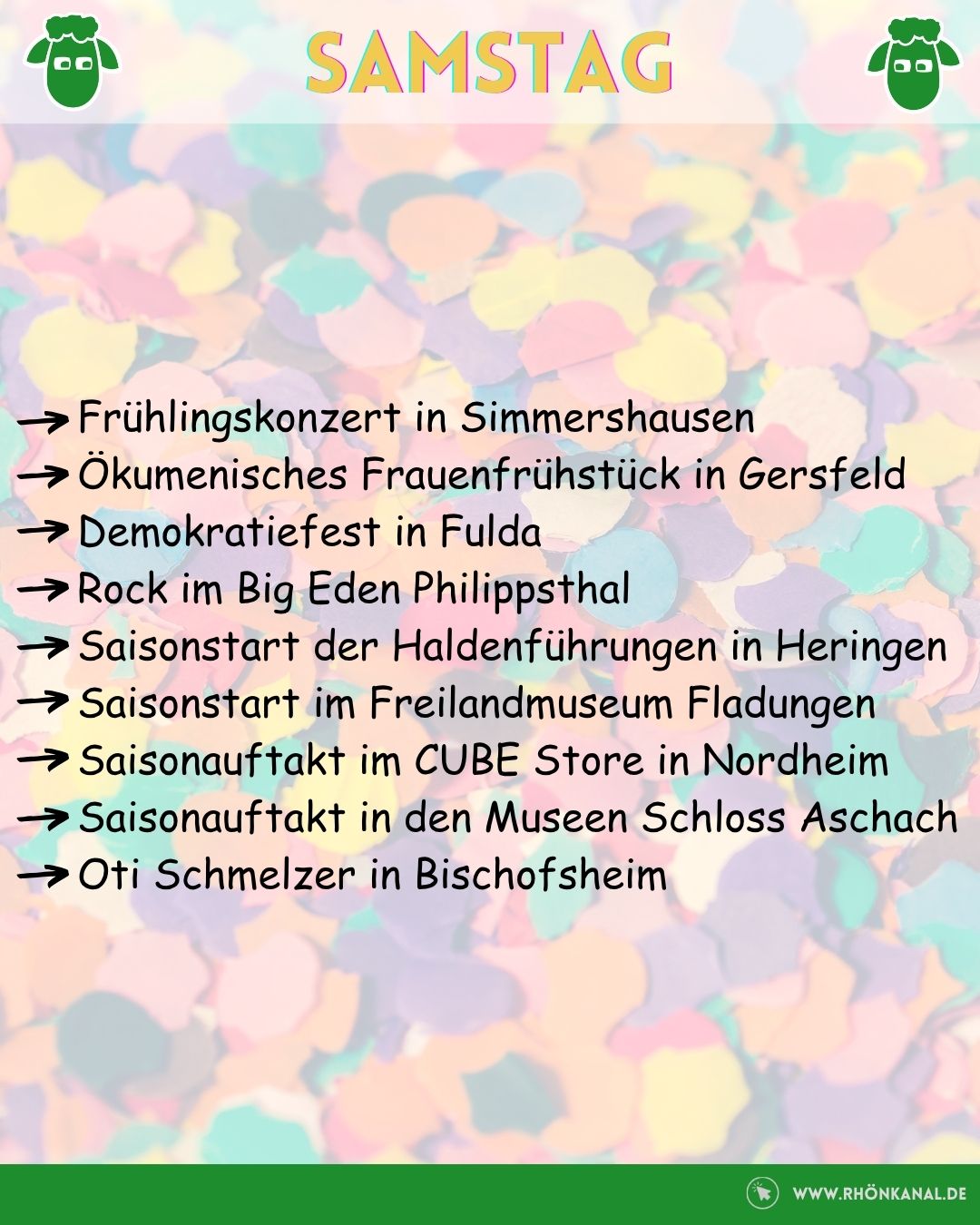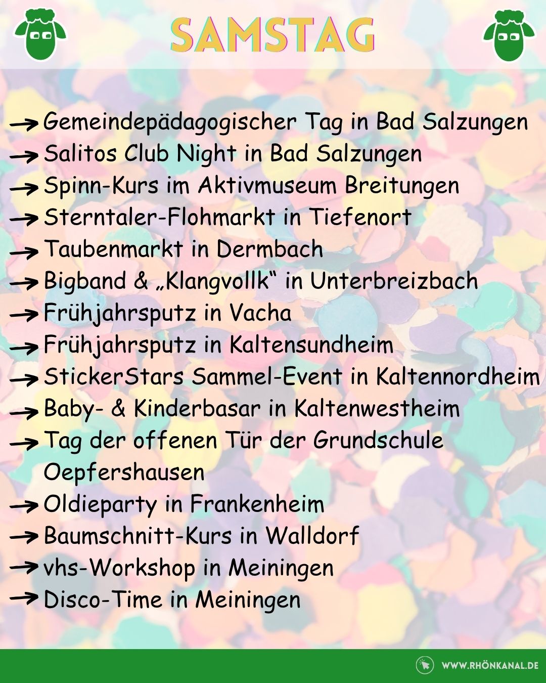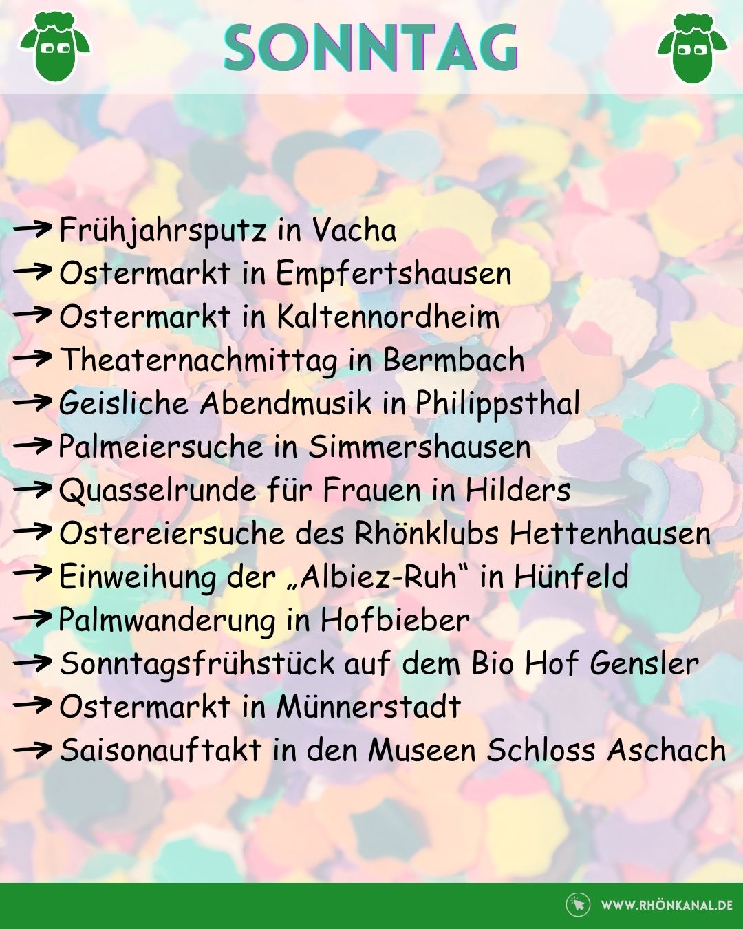 Zum gemeinschaftlichen Frühjahrsputz wird außerdem in Vacha und Kaltensundheim eingeladen. Blasmusik vom Feinsten gibt es in Simmershausen und ordentlich gelacht werden darf mit Oti Schmelzer in Bischofsheim.